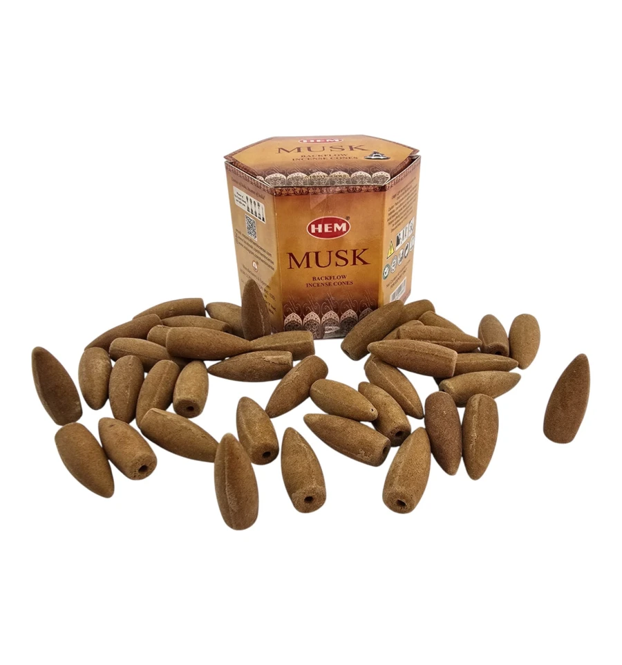 HEM Musk - ароматические конусы Backflow с тёплым мускусным ароматом от индийского производителя HEM. Со специальной подставкой Backflow дым красиво струится вниз, создавая эффект водопада. Подходят для ароматизации дома, расслабления, медитации и в качестве готового подарка.