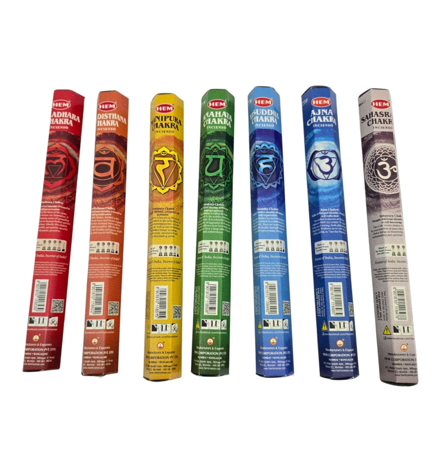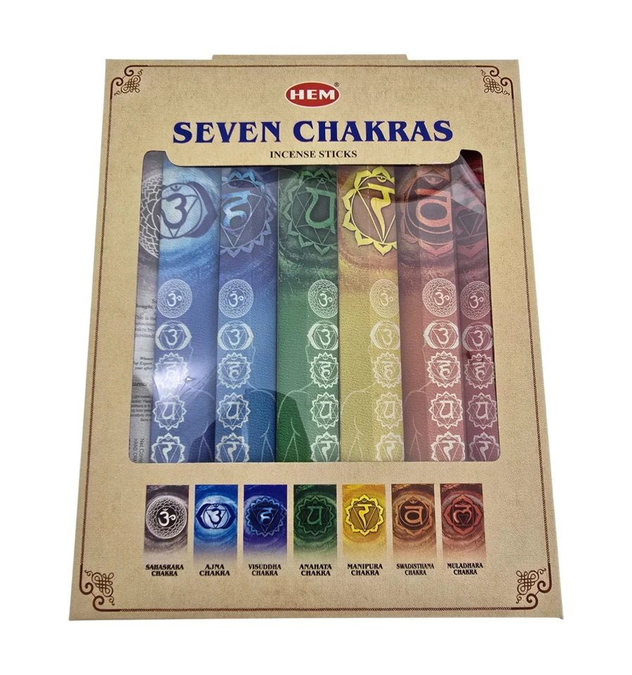 HEM Seven Chakras индийский набор масала-палочек для гармонизации пространства, медитации, йоги и домашнего уюта. Внутри семь отдельных упаковок, каждая посвящена одной из чакр. Палочки тлеют ровно и дают стойкий мягкий аромат. Отлично подходит как готовый подарок.