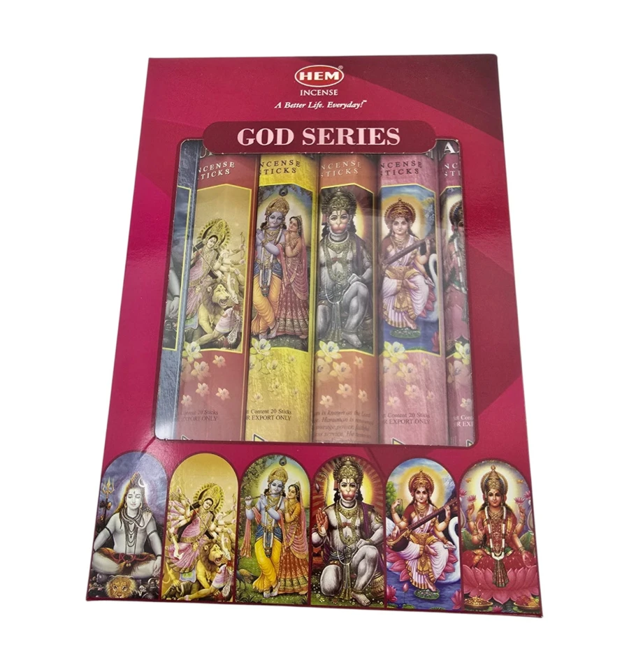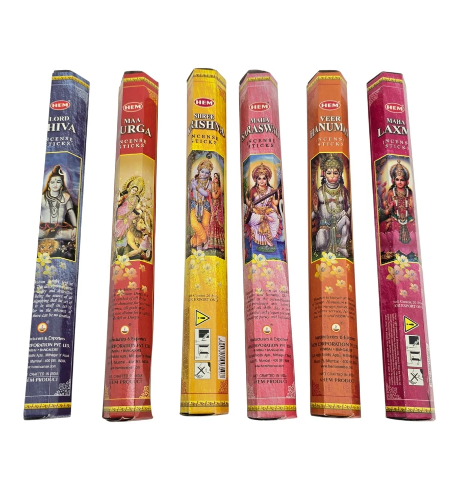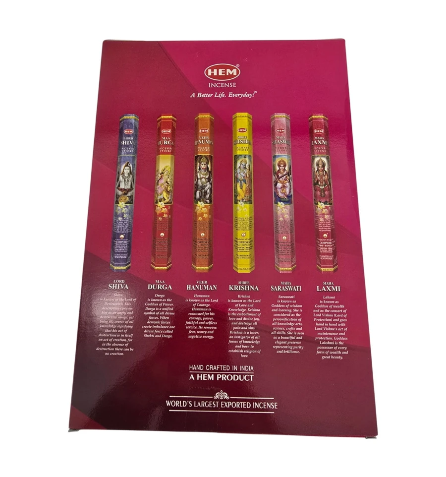HEM Corporation, Индия, один из самых известных производителей индийских благовоний ручной скрутки. Набор God Series создан как готовый подарок и для повседневной ароматизации пространства. Внутри 6 тематических ароматов, посвящённых индуистским божествам: Шива, Дурга, Хануман, Кришна, Сарасвати, Лакшми. Формат HEX по 20 палочек в каждой упаковке. Подходит для медитации и йоги, создания уюта дома, ритуальных практик и в качестве подарка.