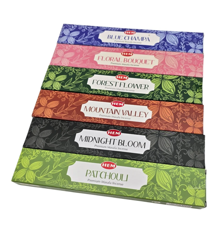 Фирменный набор индийского производителя HEM для уютной атмосферы дома или в офисе. Палочки ручной работы в формате масала. В комплект входит 6 упаковок по 15 г с ароматами: Blue Champa, Floral Bouquet, Forest Flower, Mountain Valley, Midnight Bloom, Patchouli. Подходит для медитации, йоги, релакса и как готовый подарок. В наборе есть простой держатель для палочек.