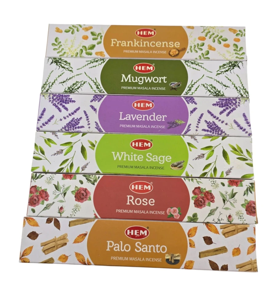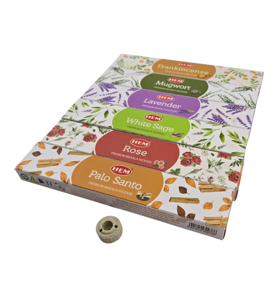 HEM Universal Masala Incense — набор индийских ароматических палочек от производителя HEM (Индия). В комплекте шесть популярных ароматов на разные случаи: Ладан (Frankincense), Полынь (Mugwort), Лаванда (Lavender), Белый шалфей (White Sage), Роза (Rose), Пало санто (Palo Santo). Подходит для медитации, йоги, расслабления, ароматизации дома и как готовый подарок. Внутри есть простая подставка для палочек.