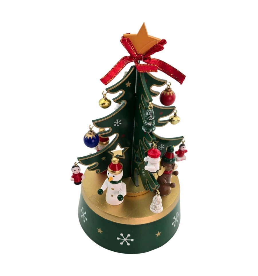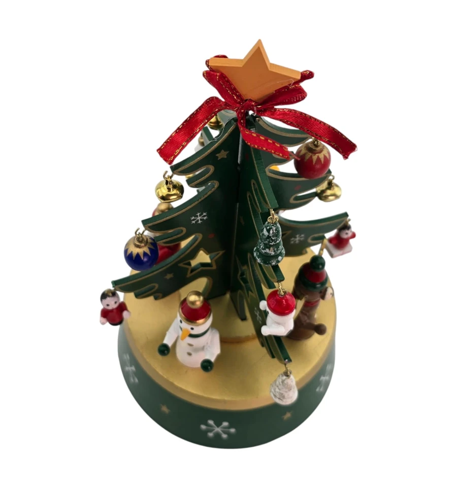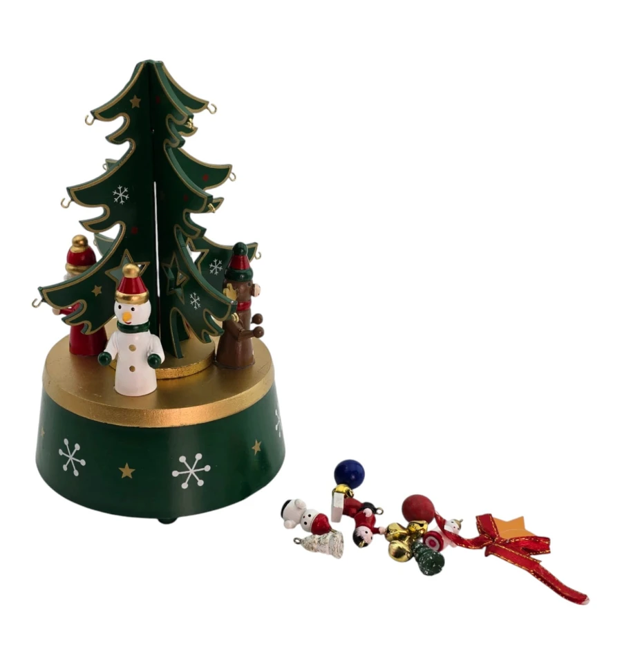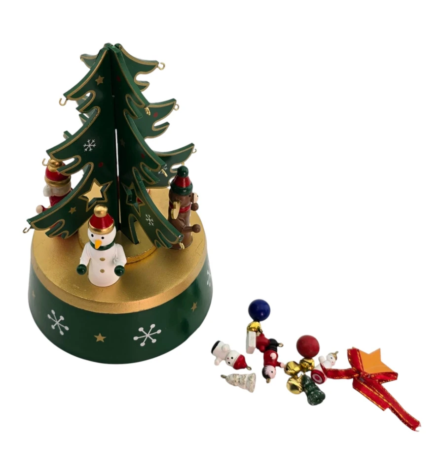 Компактная настольная елка из дерева с мини-игрушками и колокольчиками. Механический музыкальный механизм с подзаводом играет мелодию без батареек. Подходит для декора дома и офиса или в качестве праздничного подарка. Устойчивая круглая подставка обеспечивает надежное размещение. Внимание: мелкие детали, не для детей до 3 лет.