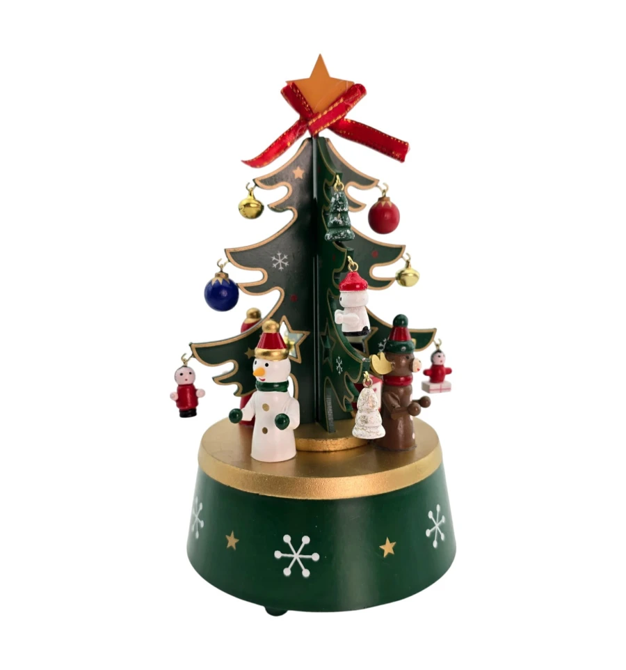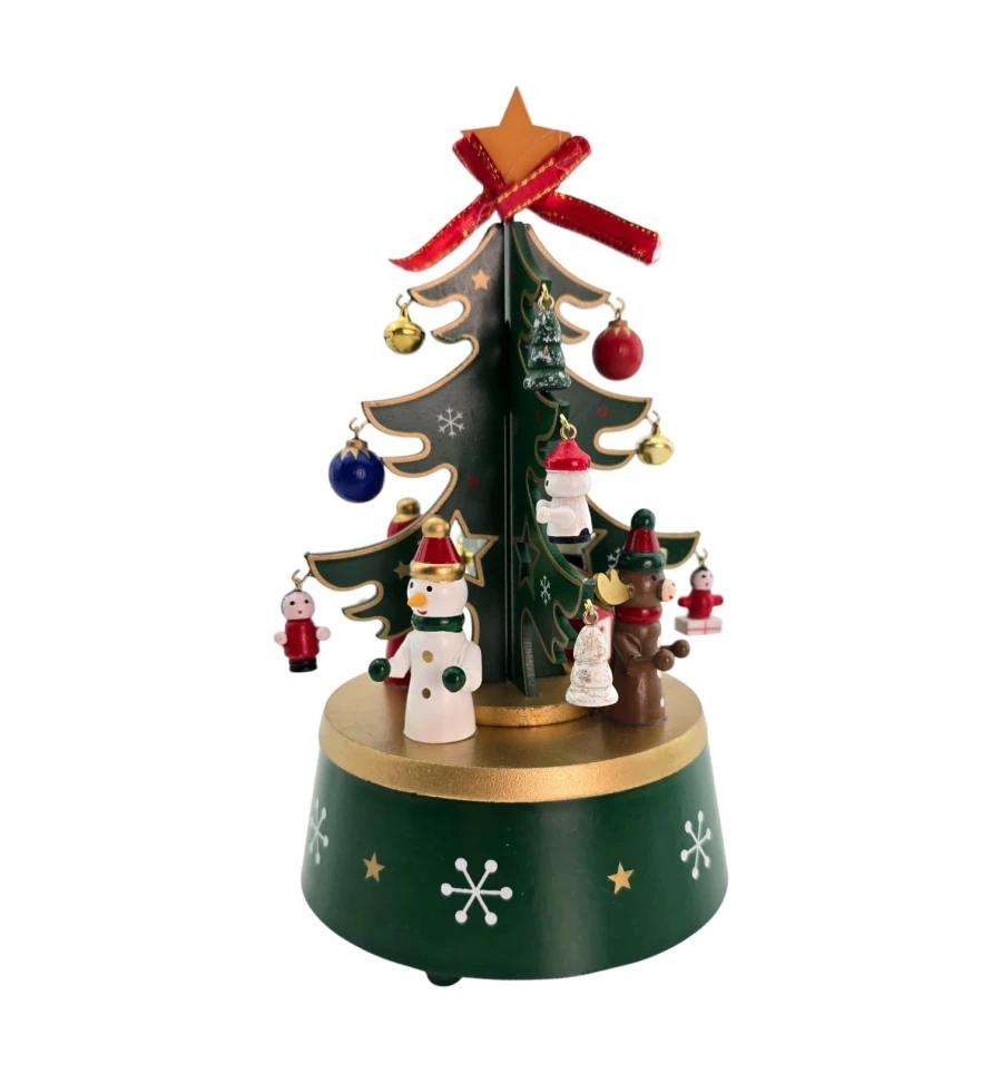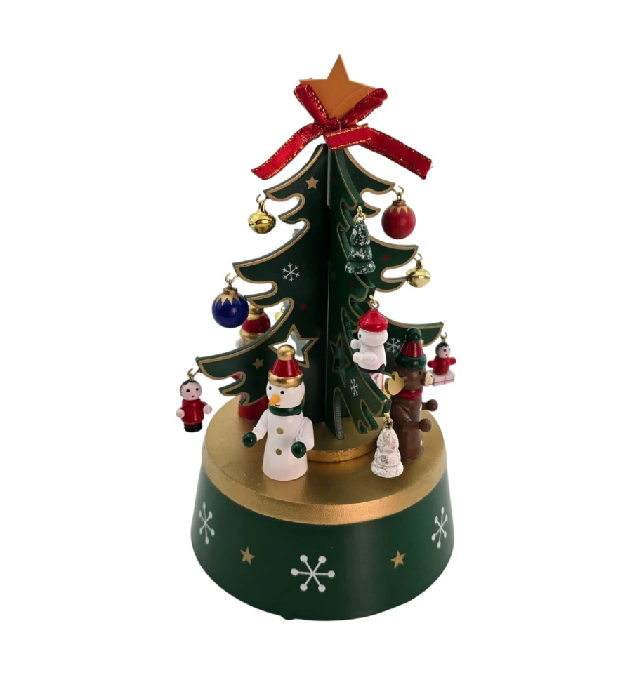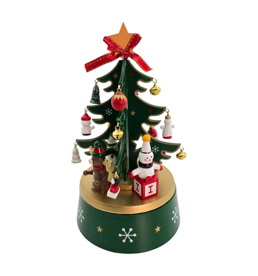 Компактная настольная елка из дерева с мини-игрушками и колокольчиками. Механический музыкальный механизм с подзаводом играет мелодию без батареек. Подходит для декора дома и офиса или в качестве праздничного подарка. Устойчивая круглая подставка обеспечивает надежное размещение. Внимание: мелкие детали, не для детей до 3 лет.