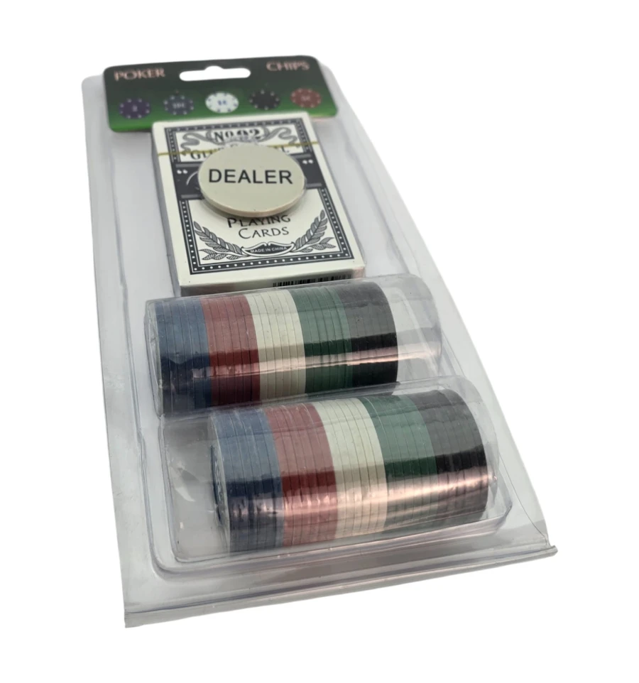Практичный комплект для домашних игр в покер. В наборе 60 фишек пяти номиналов по 12 каждой, колода карт покерного размера и жетон DEALER. Фишки диаметром 3,8 см удобны в руке и подходят для Техасского холдема и других дисциплин. Легко взять на вечеринку или в дорогу.