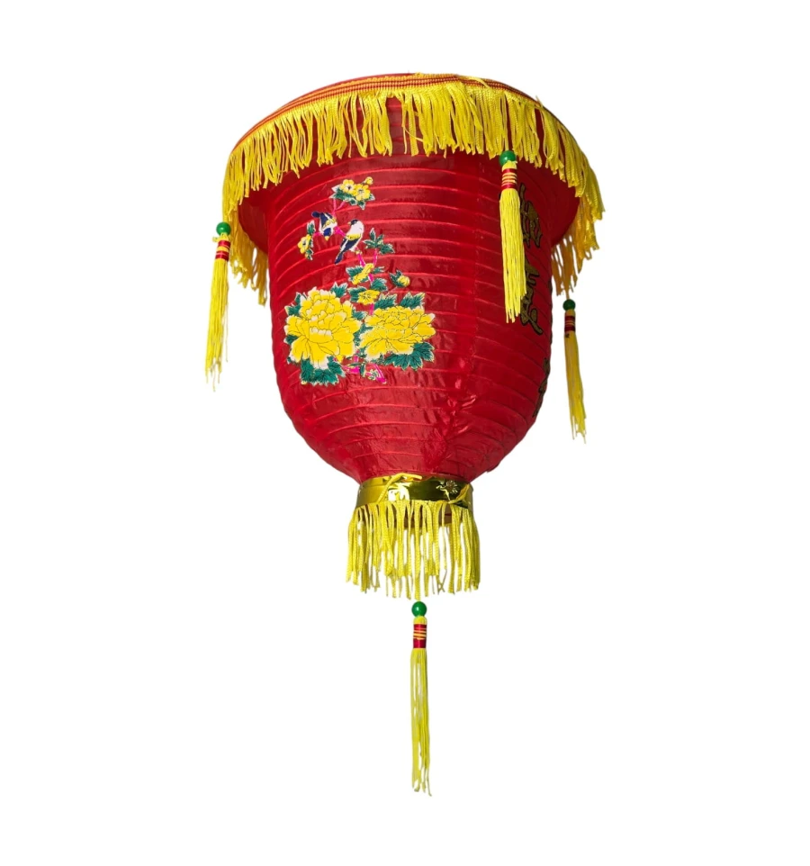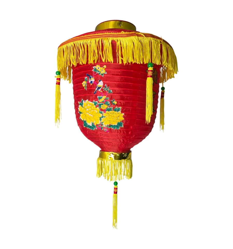 Традиционный красный фонарь для праздников и интерьеров. На корпусе вышиты иероглифы 如意吉祥 - пожелание «пусть всё будет как задумано и благополучно», символ удачи и благоприятных перемен. Рисунок с пионами означает богатство и процветание. Фонарь выполнен из плотной синтетической ткани (полиэстер) с бахромой и кистями, имеет складной металлический каркас и крючок для подвеса.