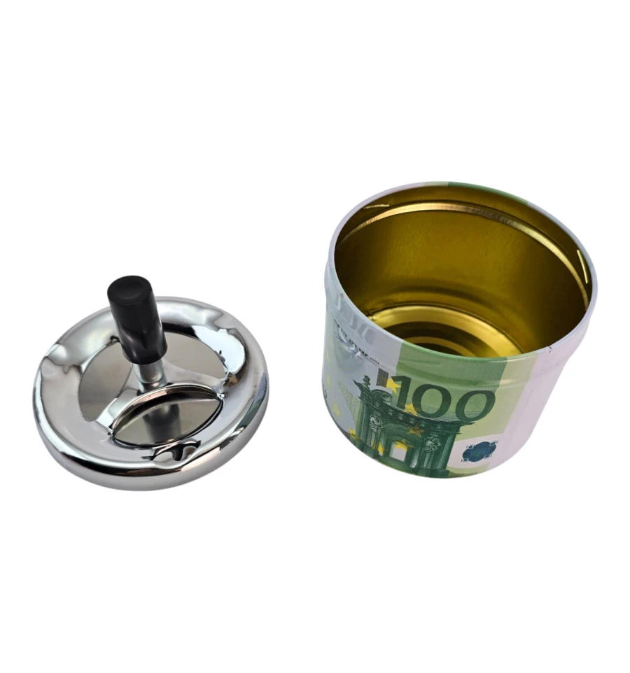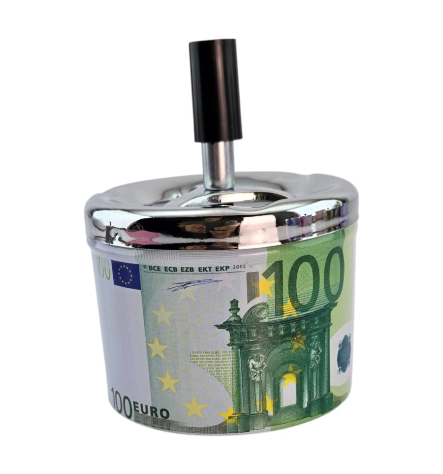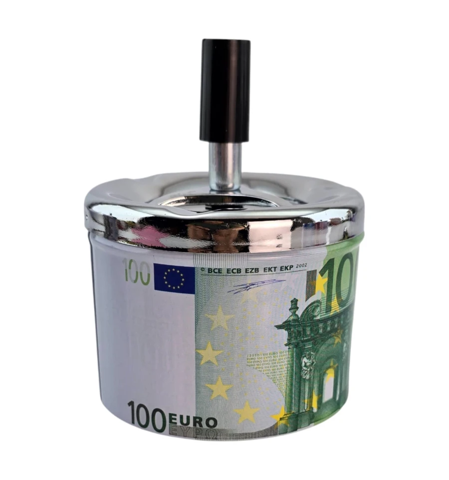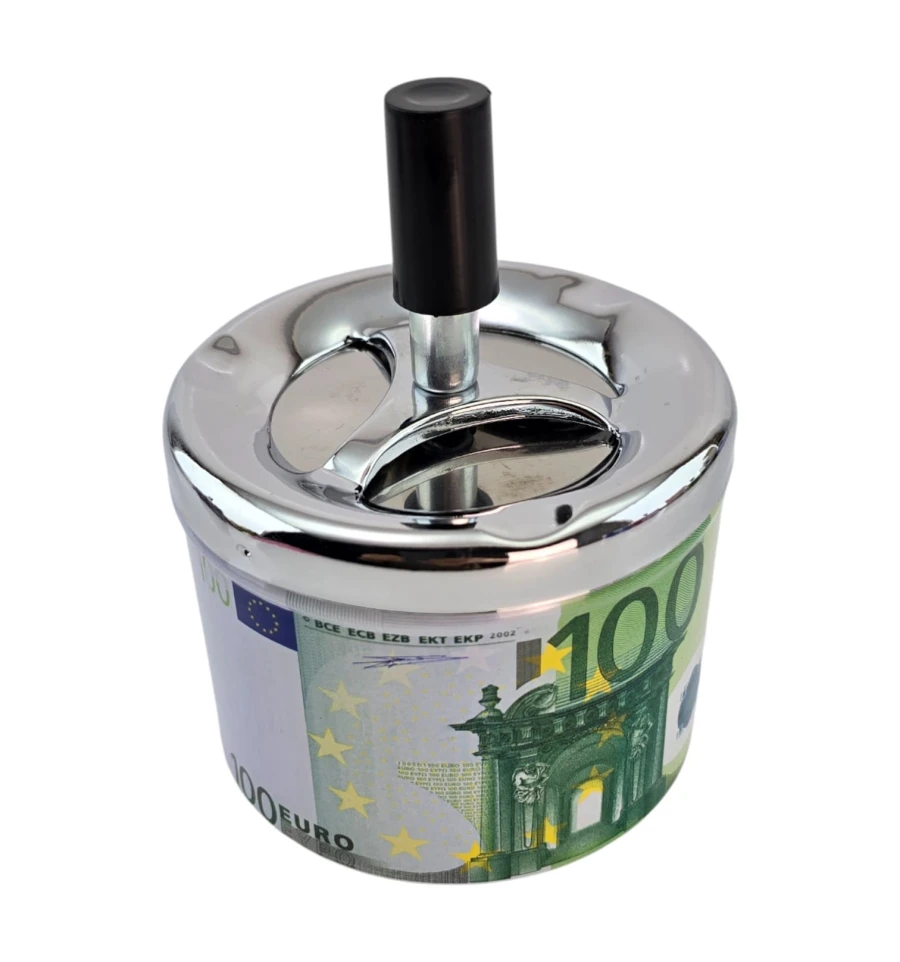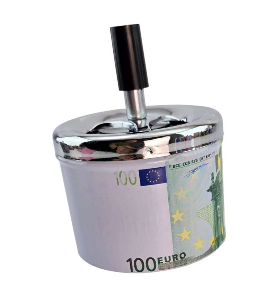 Стильная пепельница со спиральным механизмом в дизайне «100 Евро». Нажмите на кнопку - пепел и окурок проваливаются внутрь, что уменьшает запах и беспорядок. Металлический корпус устойчив к нагреву, легко очищается. Компактный размер удобен для дома, офиса, бара или террасы. Практичный подарок курильщику и заметный интерьерный акцент.