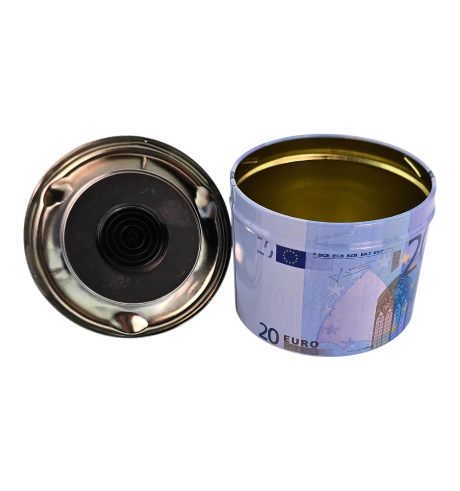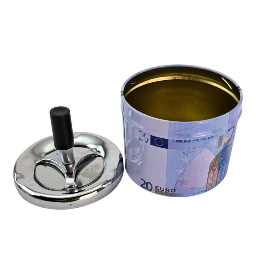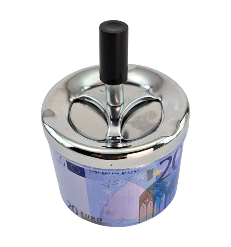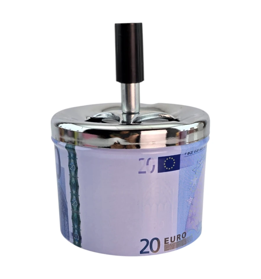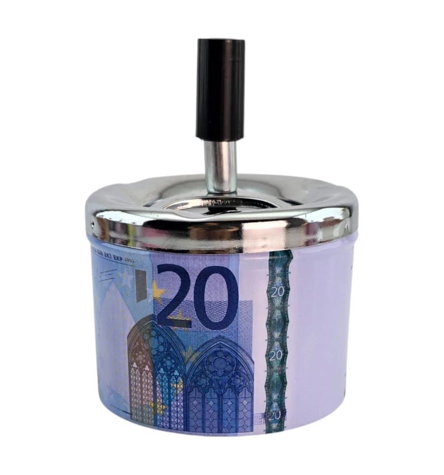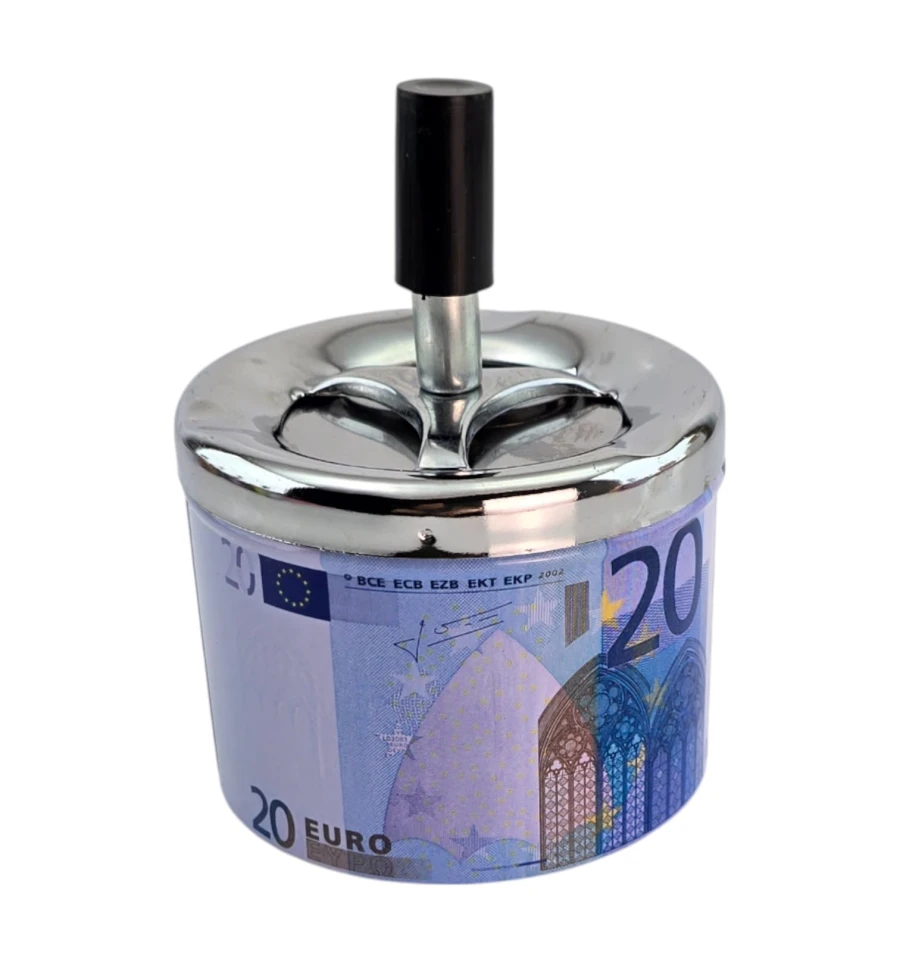 Стильная металлическая пепельница с принтом банкноты 20 евро. Механизм пресса одним нажатием «прячет» пепел и окурки внутрь, уменьшая запах и разлет пепла. Подходит для дома, офиса, бара и как оригинальный подарок курильщику.