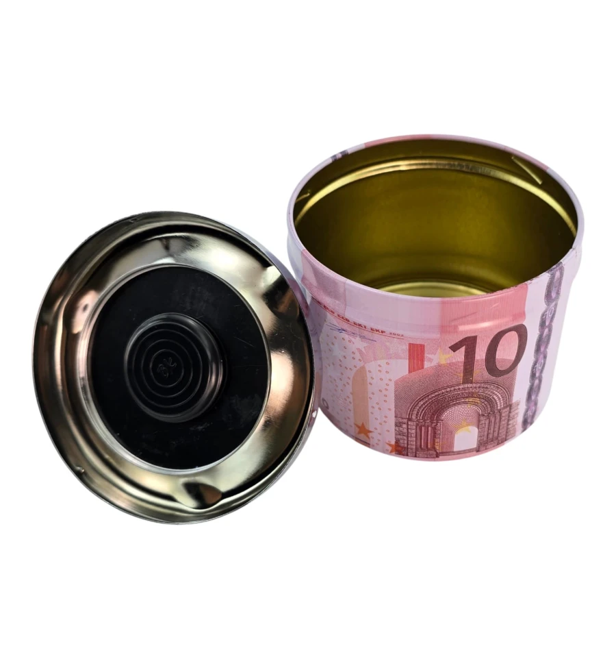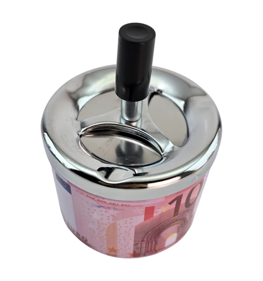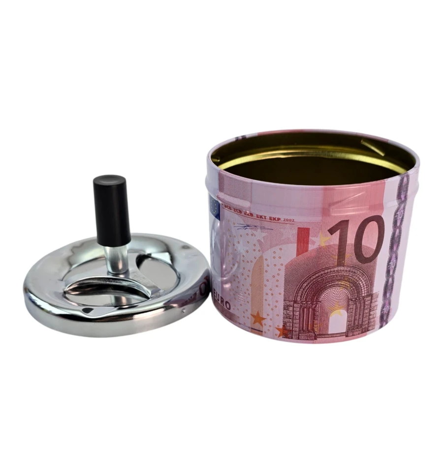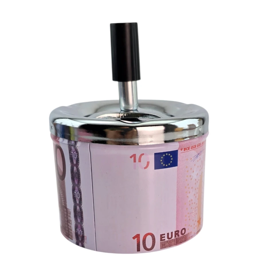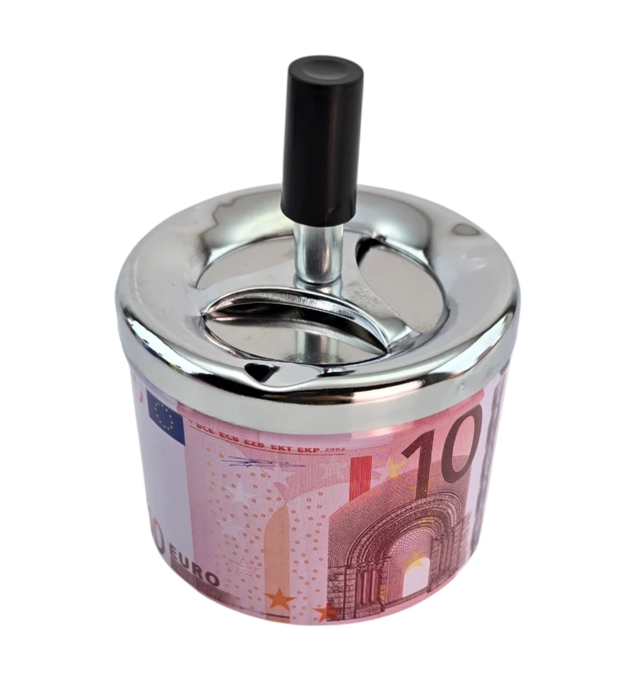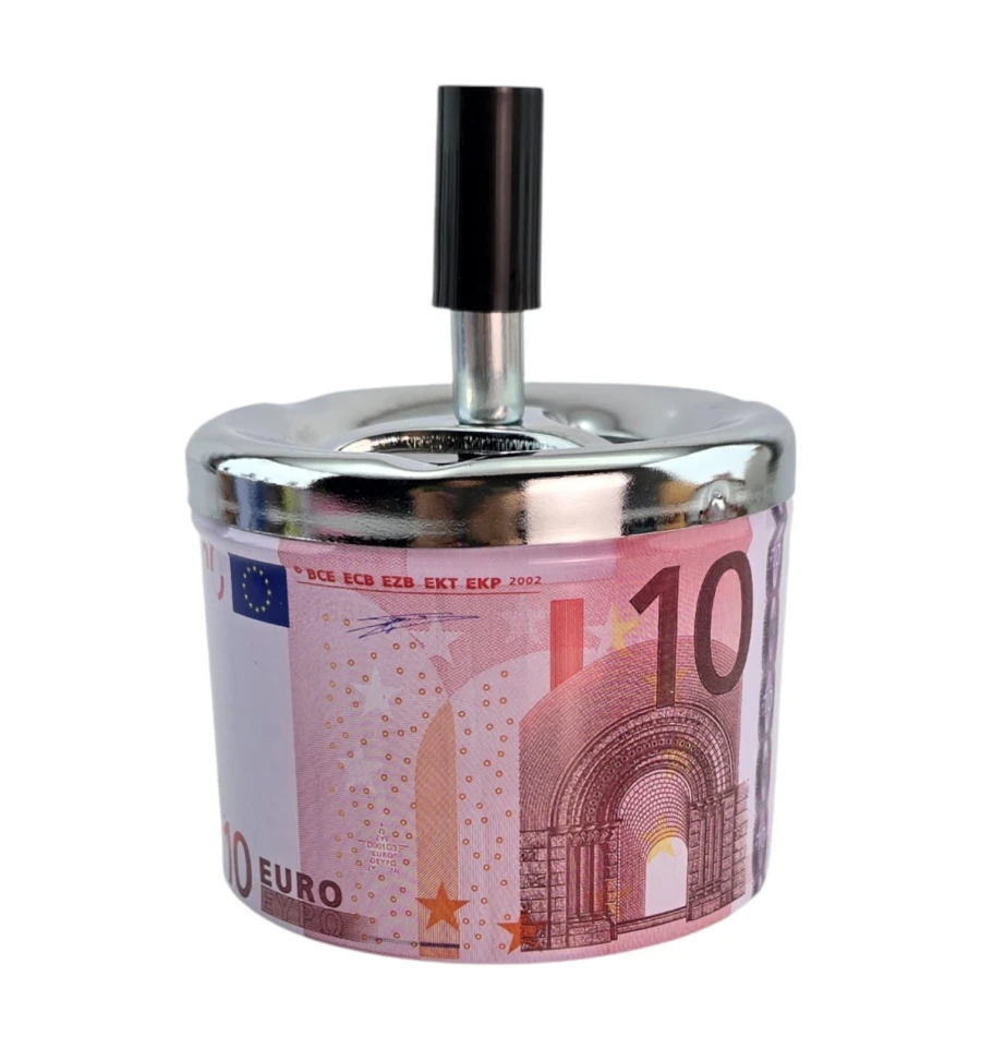 Стильная металлическая пепельница с принтом банкноты 20 евро. Механизм пресса одним нажатием «прячет» пепел и окурки внутрь, уменьшая запах и разлет пепла. Подходит для дома, офиса, бара и как оригинальный подарок курильщику.