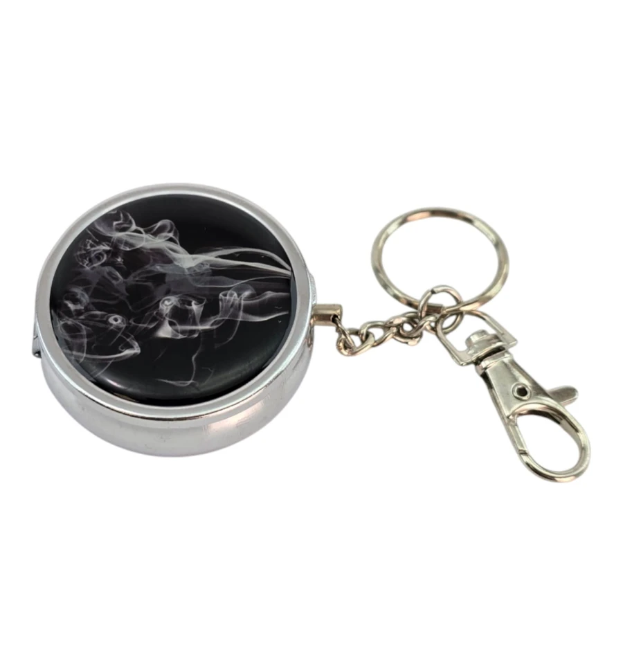 Компактная карманная пепельница в формате брелока — удобно брать с собой и не оставлять пепел и окурки где попало. Металлический корпус с откидной крышкой закрывается плотно, а внутри есть складной держатель для сигареты — можно положить сигарету во время паузы. Сверху стильный принт «дым» на тёмном фоне. Кольцо и карабин позволяют закрепить пепельницу на ключах, сумке или рюкзаке. Отлично подходит для прогулок, поездок, фестивалей, террасы и автомобиля — везде, где нет стационарной пепельницы.