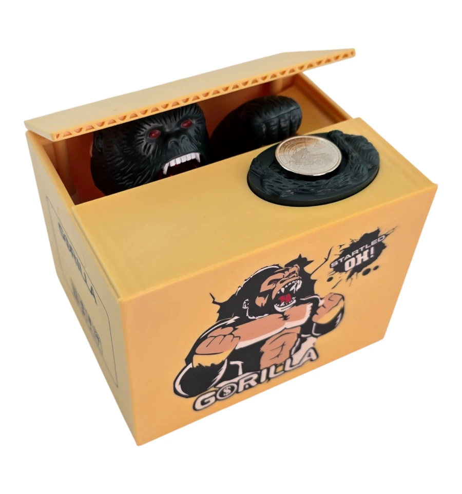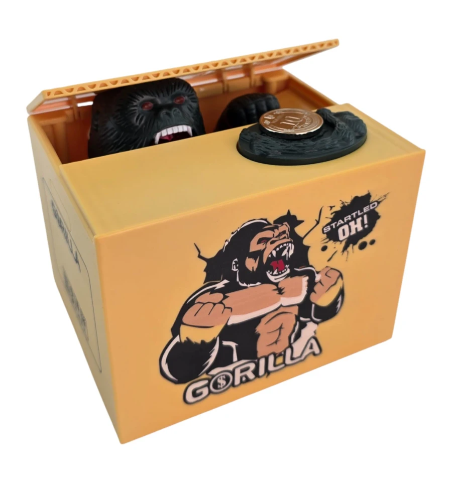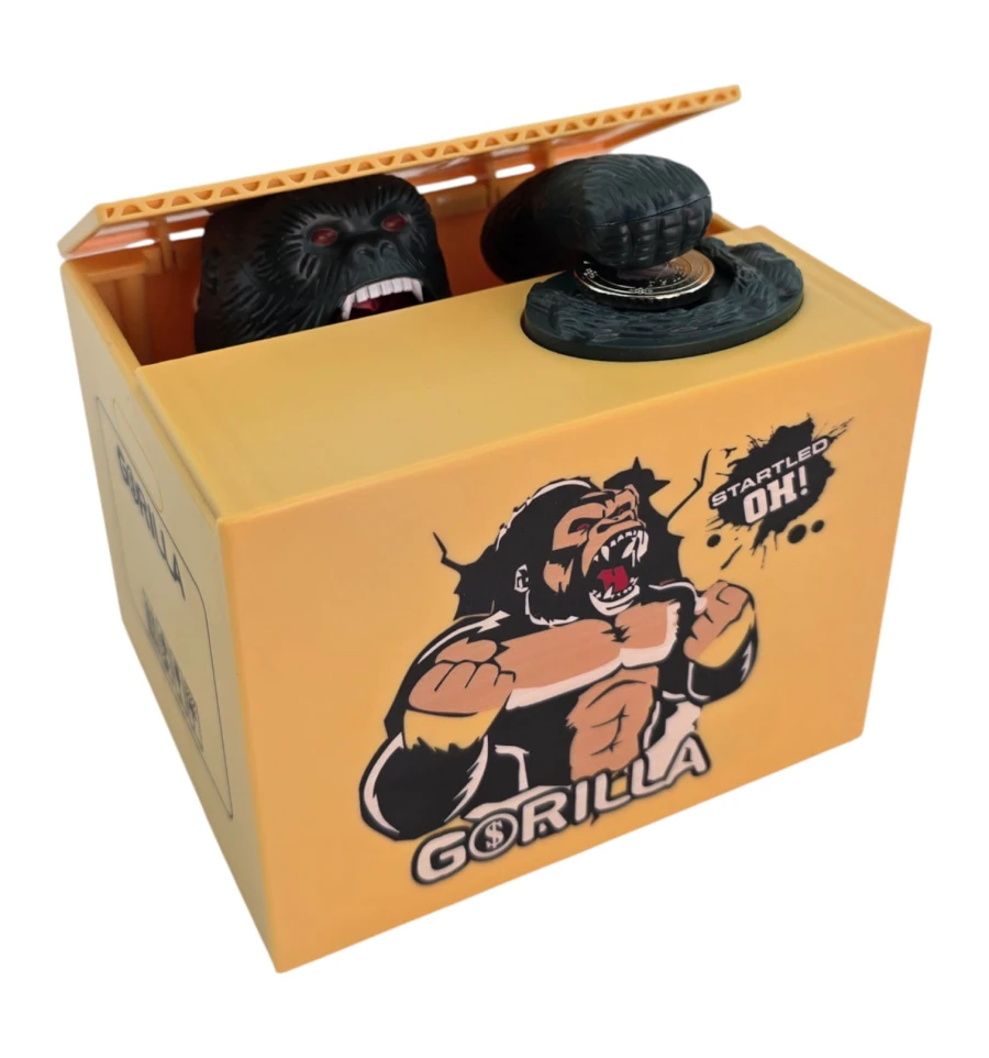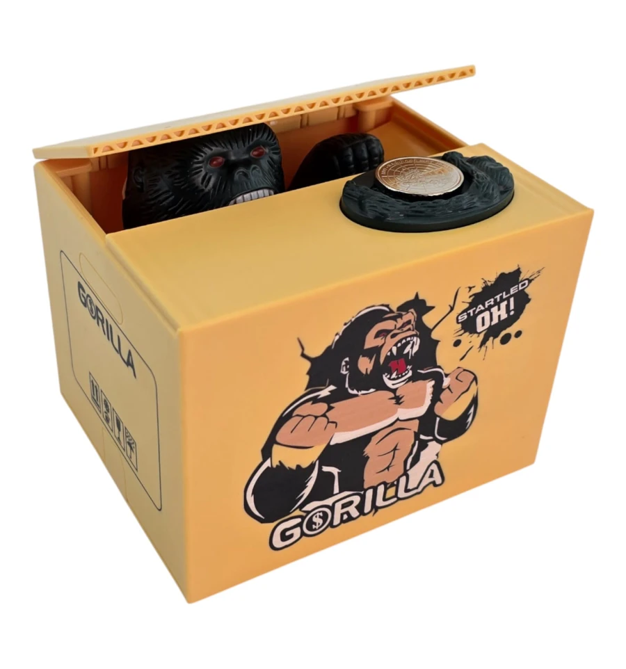 Интерактивная копилка в виде коробки с гориллой, которая «крадёт» монеты. Положите монетку на площадку - крышка приоткроется, и лапа гориллы аккуратно стянет монету внутрь. Такая «умная» копилка мотивирует откладывать мелочь, поднимает настроение и выделяется в интерьере. Отлично смотрится на рабочем столе, в детской, на ресепшене, в кафе и магазинах.