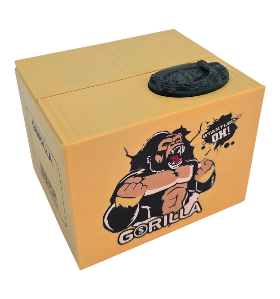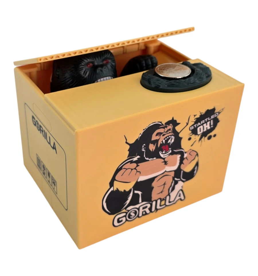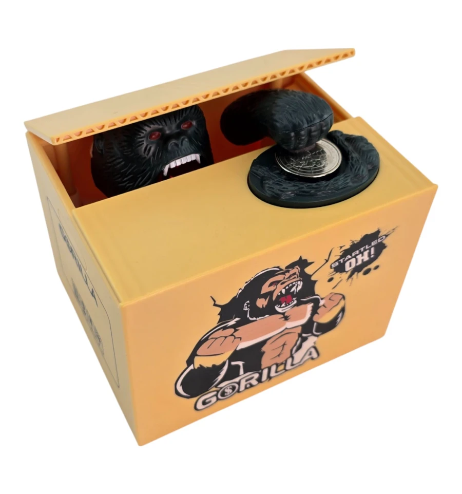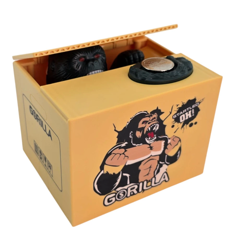 Интерактивная копилка в виде коробки с гориллой, которая «крадёт» монеты. Положите монетку на площадку - крышка приоткроется, и лапа гориллы аккуратно стянет монету внутрь. Такая «умная» копилка мотивирует откладывать мелочь, поднимает настроение и выделяется в интерьере. Отлично смотрится на рабочем столе, в детской, на ресепшене, в кафе и магазинах.