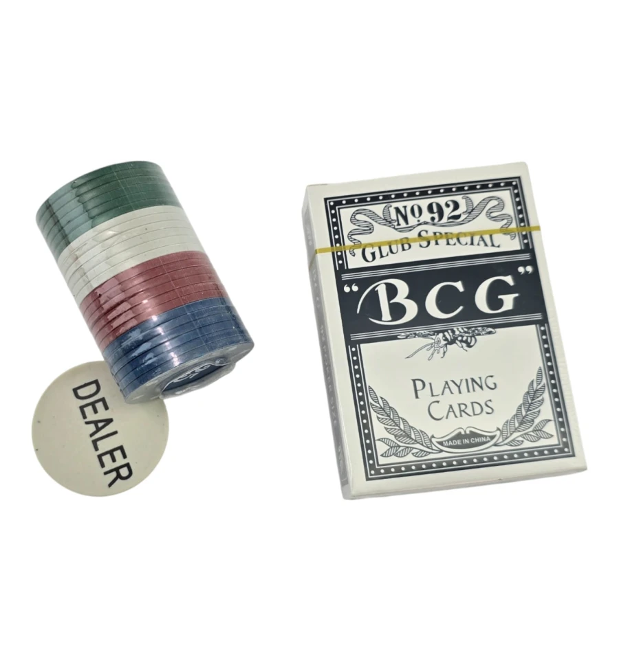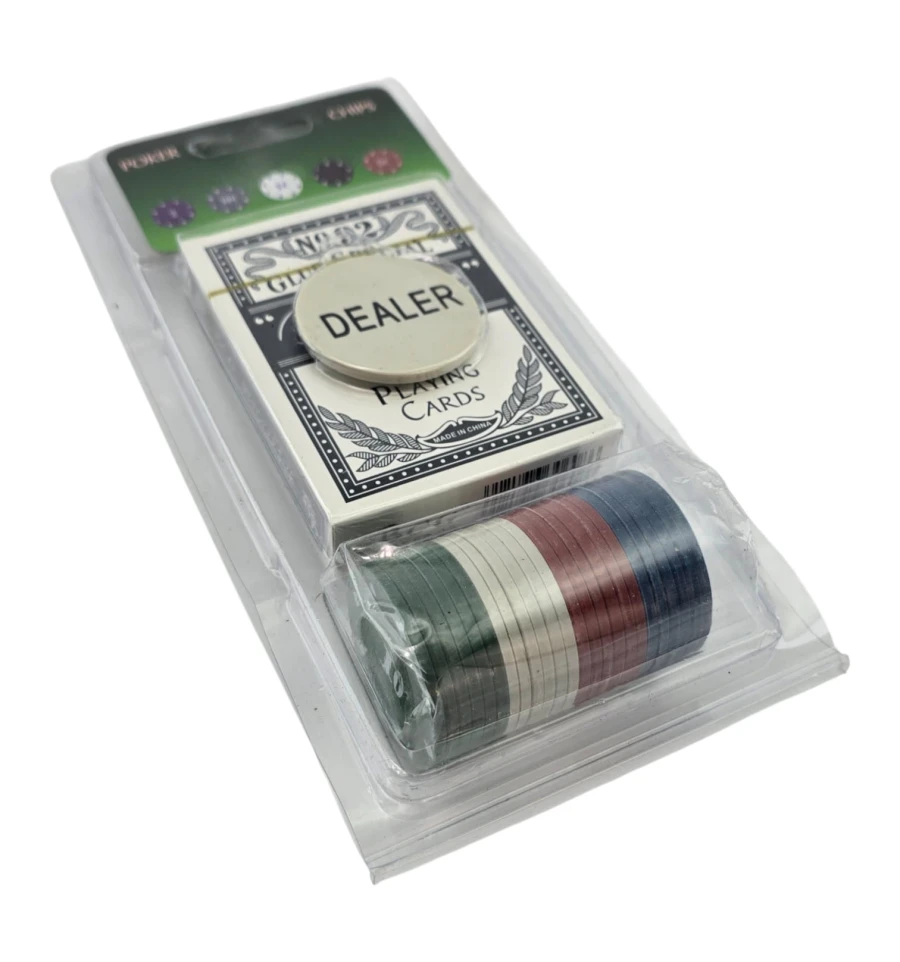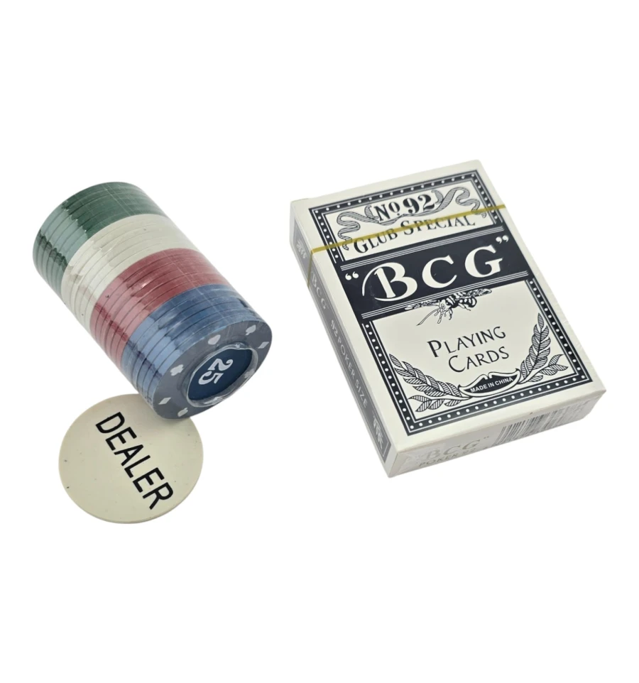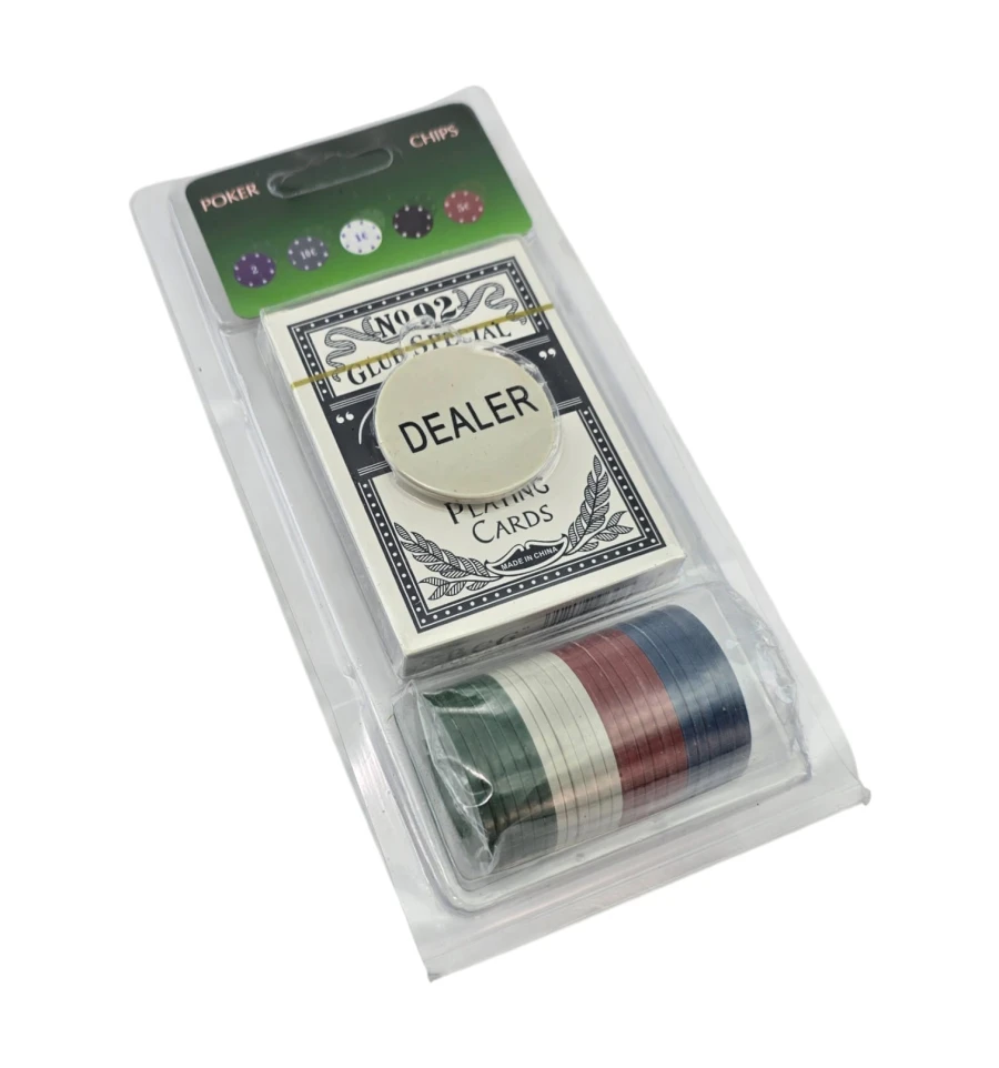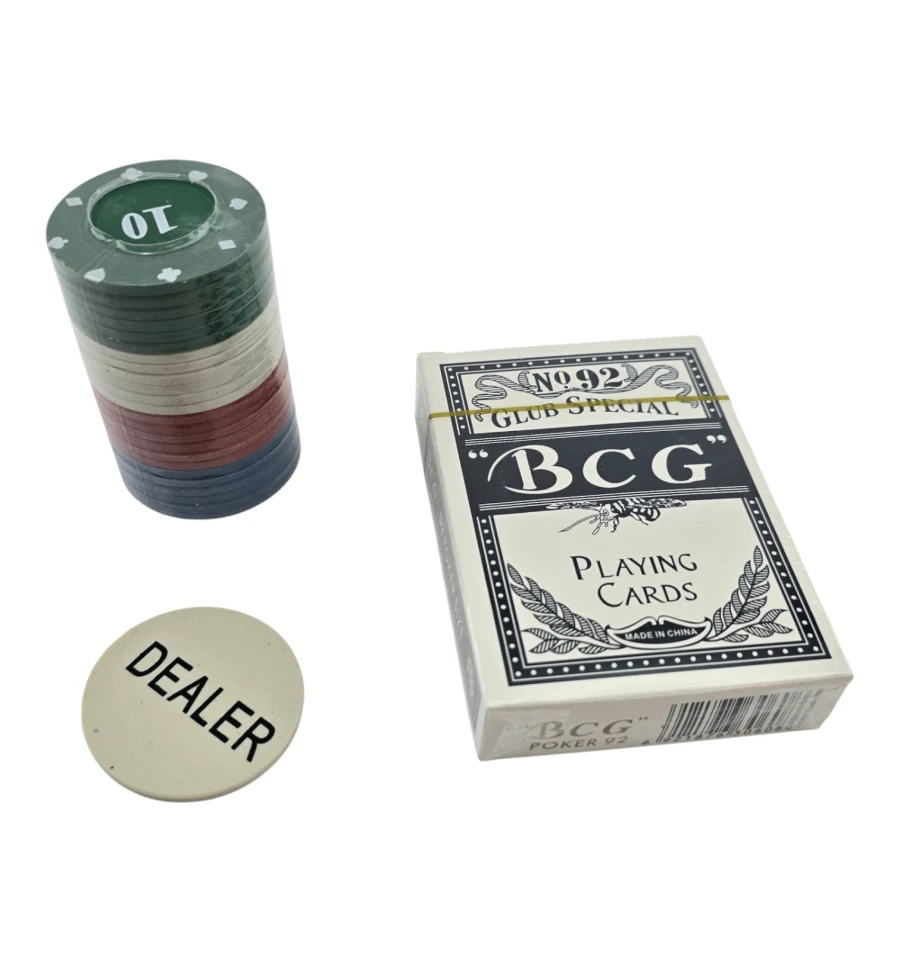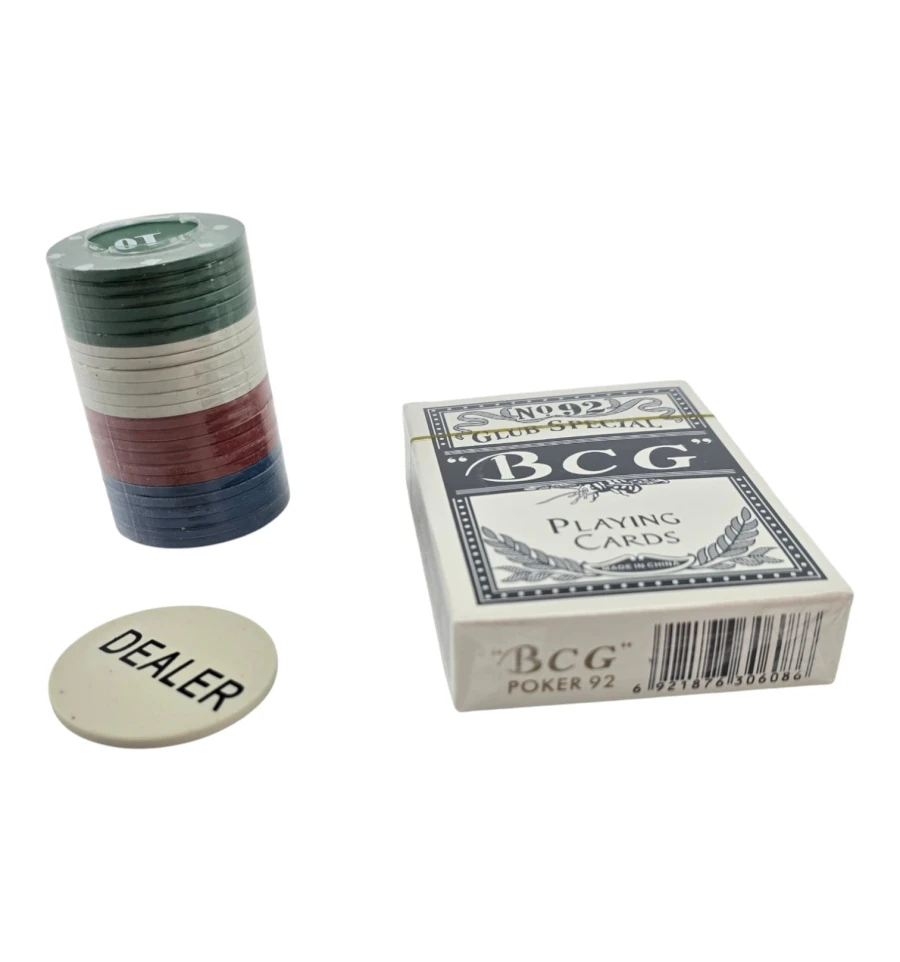 Комплектация: фишки 40 шт + колода 54 карты + жетон Dealer 1 шт