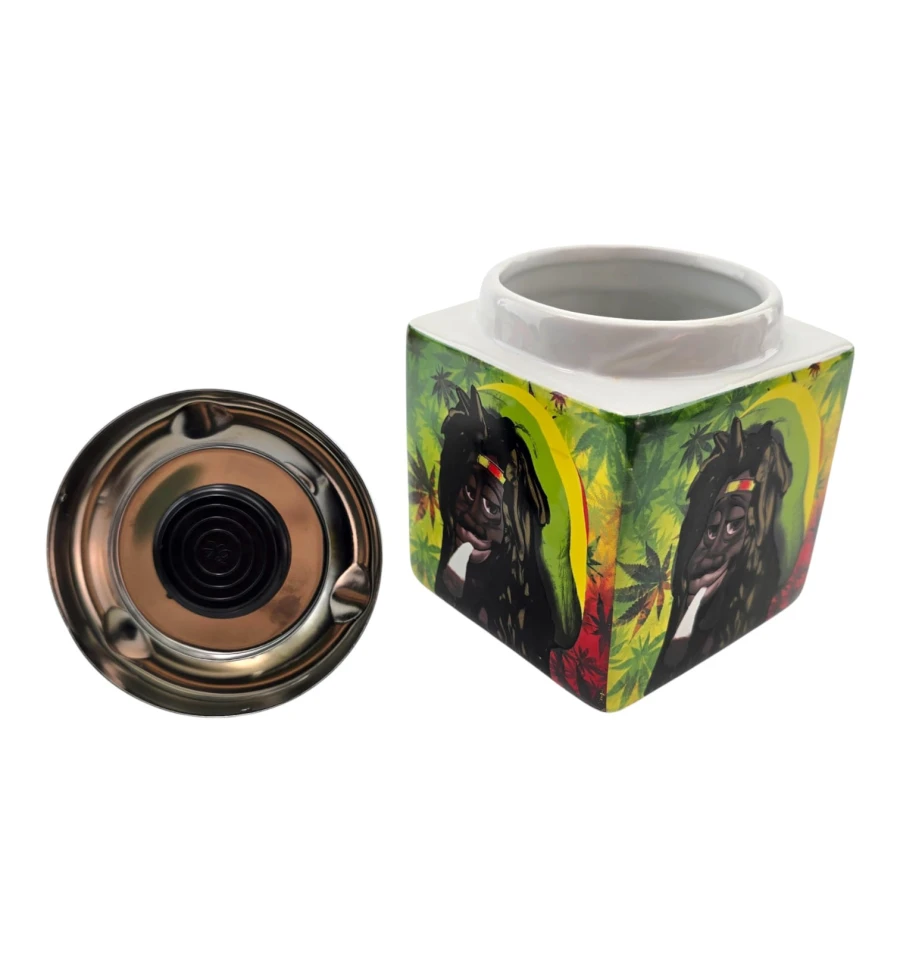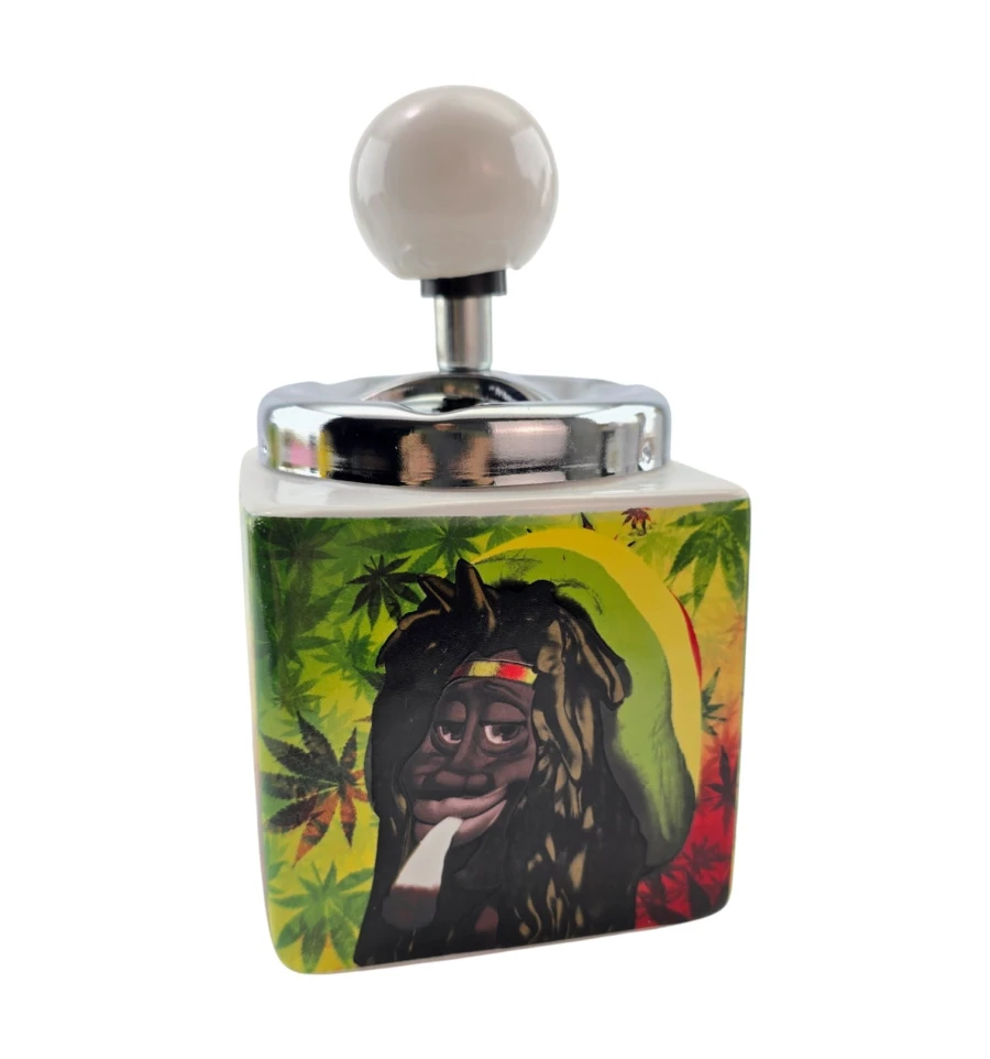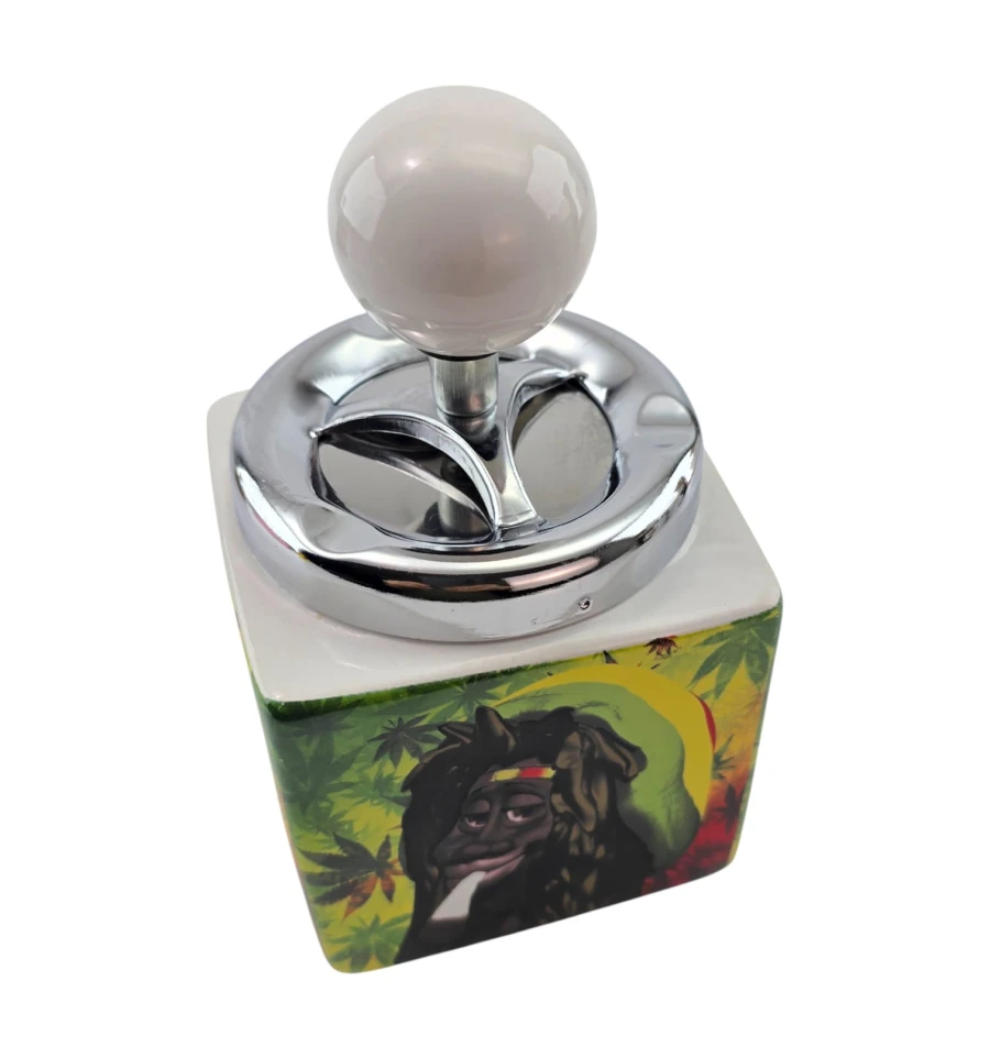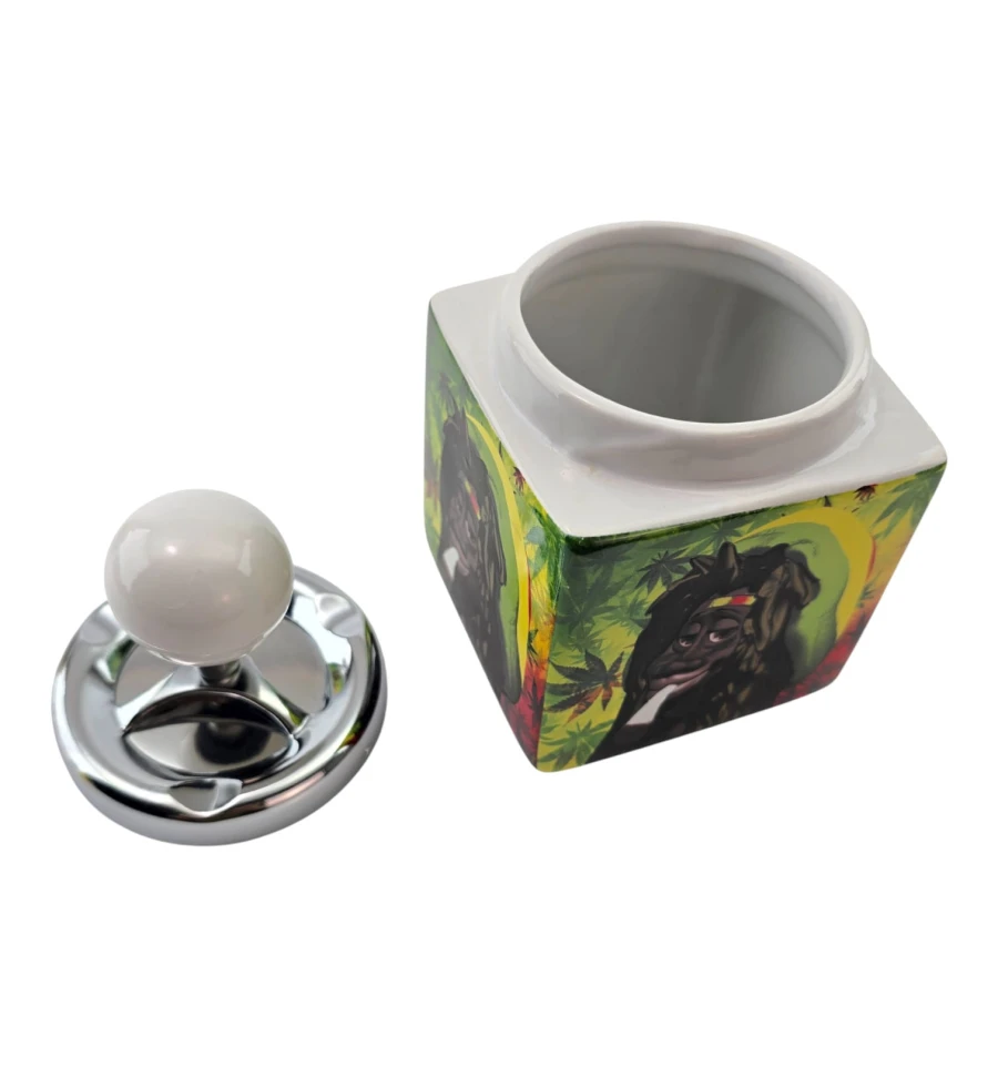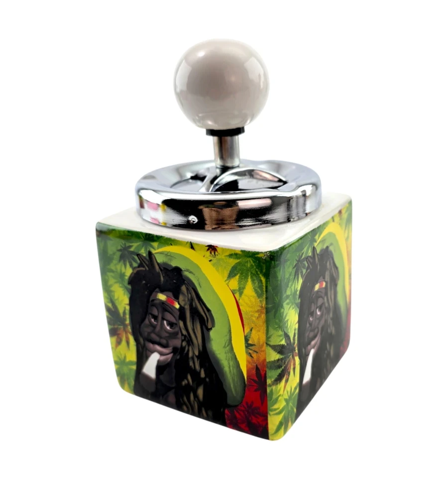 Настольная пепельница в форме куба с ярким принтом в стиле Rasta. Керамическая чаша сочетается с металлической крышкой-прессом: одним нажатием пепел и окурки проваливаются внутрь, уменьшая запах и не давая пеплу разлетаться. Удобна для дома, балкона, офиса или лаунж-зоны. Легко разбирается для чистки.