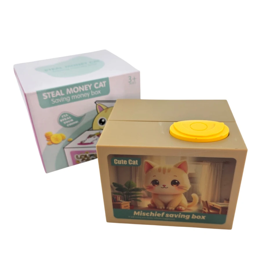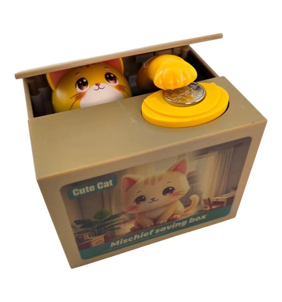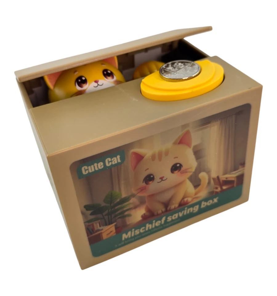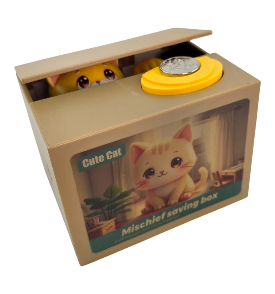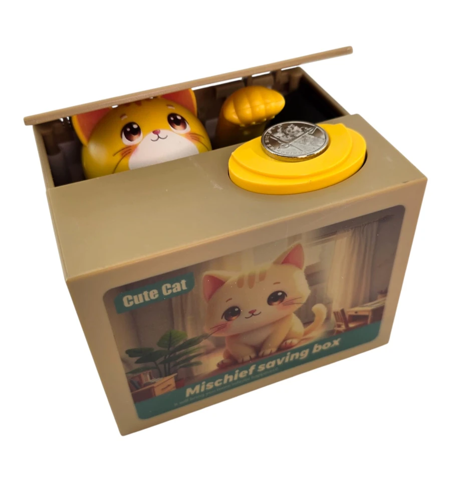 Интерактивная копилка в виде коробочки с милым котёнком Cute Cat. Положите монету на жёлтую площадку, крышка откроется, кот выглянет и лапкой утащит монету внутрь. Внутри есть переключатель питания, а для извлечения накоплений предусмотрена круглая крышка снизу. Забавный способ приучить ребёнка копить и приятный подарок для взрослых.