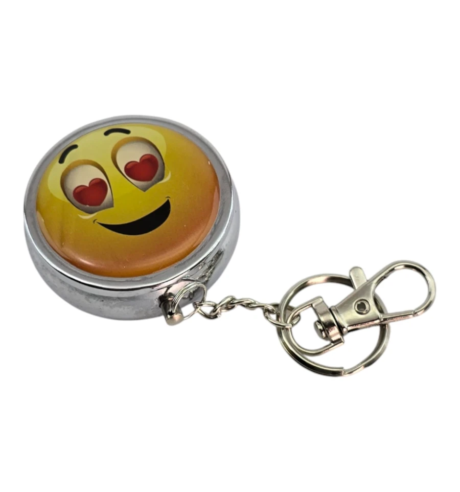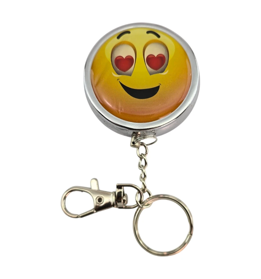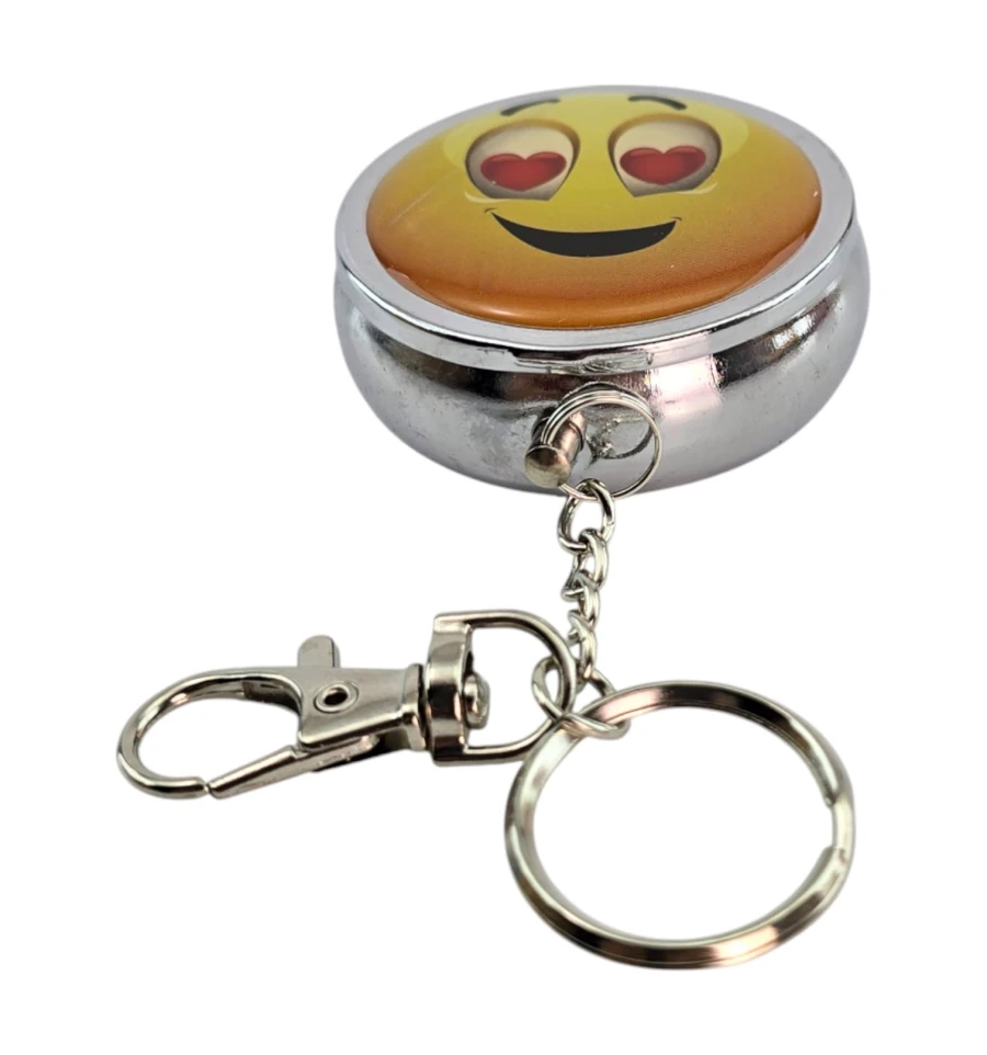 Компактная карманная пепельница-брелок - удобно брать с собой и не оставлять пепел и окурки где попало. Металлический корпус с плотно закрывающейся откидной крышкой, внутри складной держатель для сигареты - можно положить её во время паузы. Сверху яркий принт «смайл с сердечками». Кольцо и карабин позволяют закрепить пепельницу на ключах, сумке или рюкзаке. Подойдёт для прогулок, поездок, фестивалей, террасы и автомобиля - везде, где нет стационарной пепельницы.