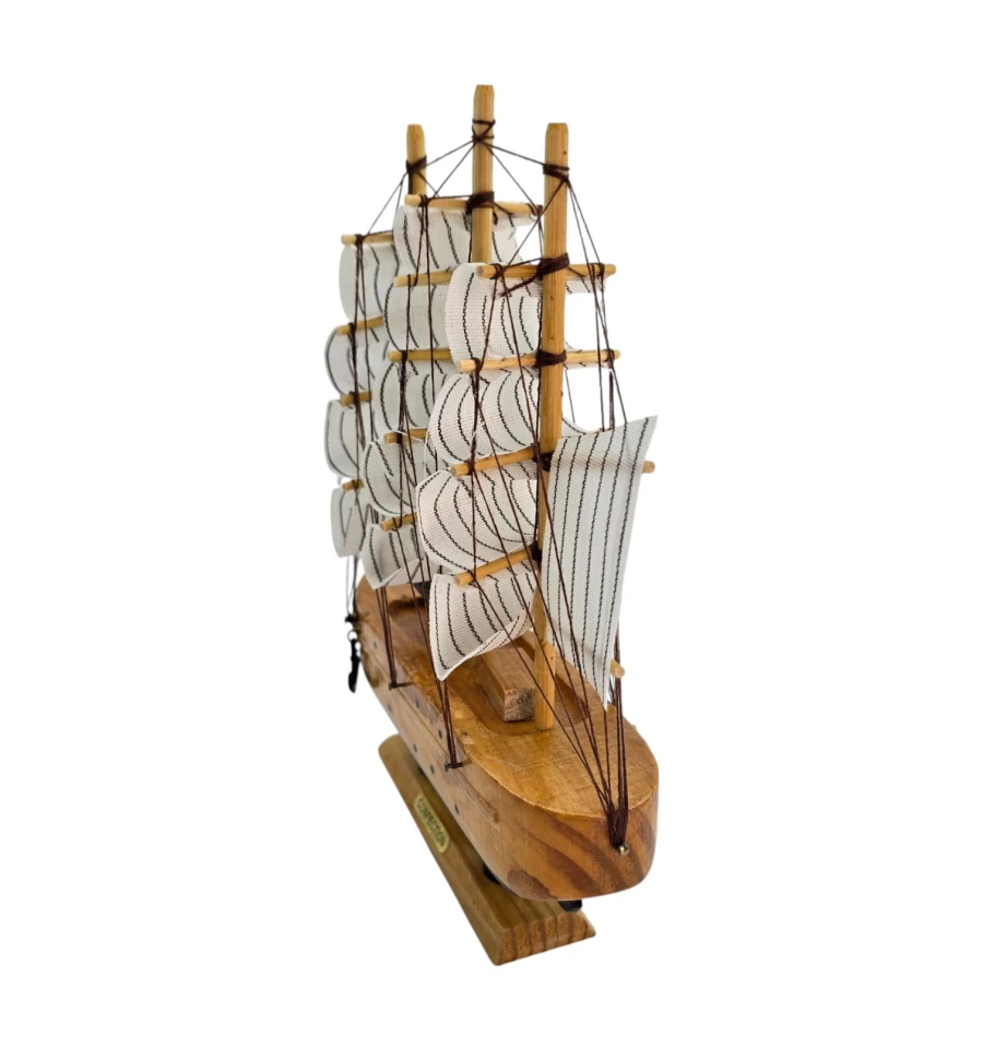Настольная модель парусного корабля в натурально-белой гамме. Деревянный корпус и мачты, тканевые паруса и шнуровый такелаж создают выразительный морской акцент для полки, камина или рабочего стола. Отличный подарок любителям морской тематики и стильный элемент интерьера.