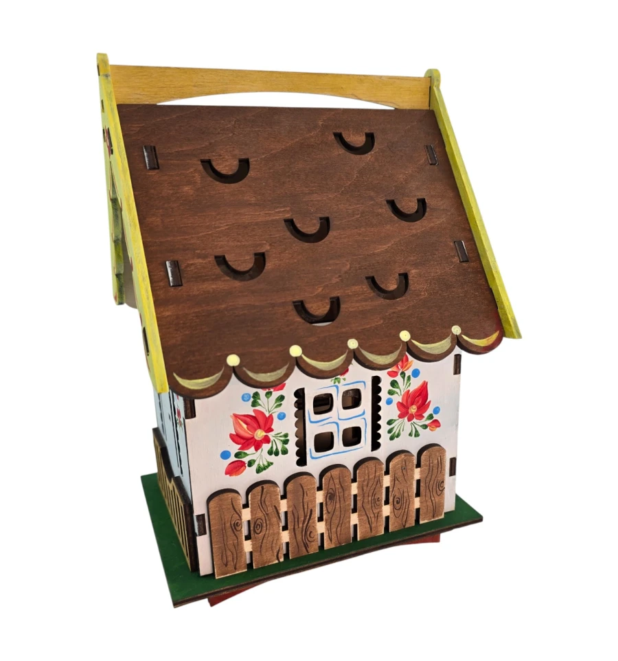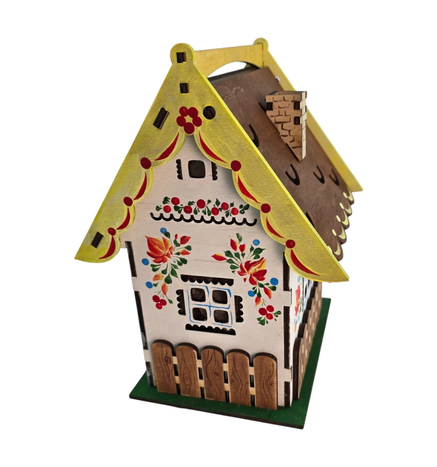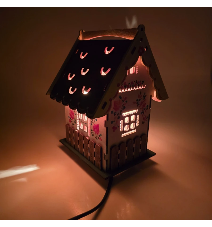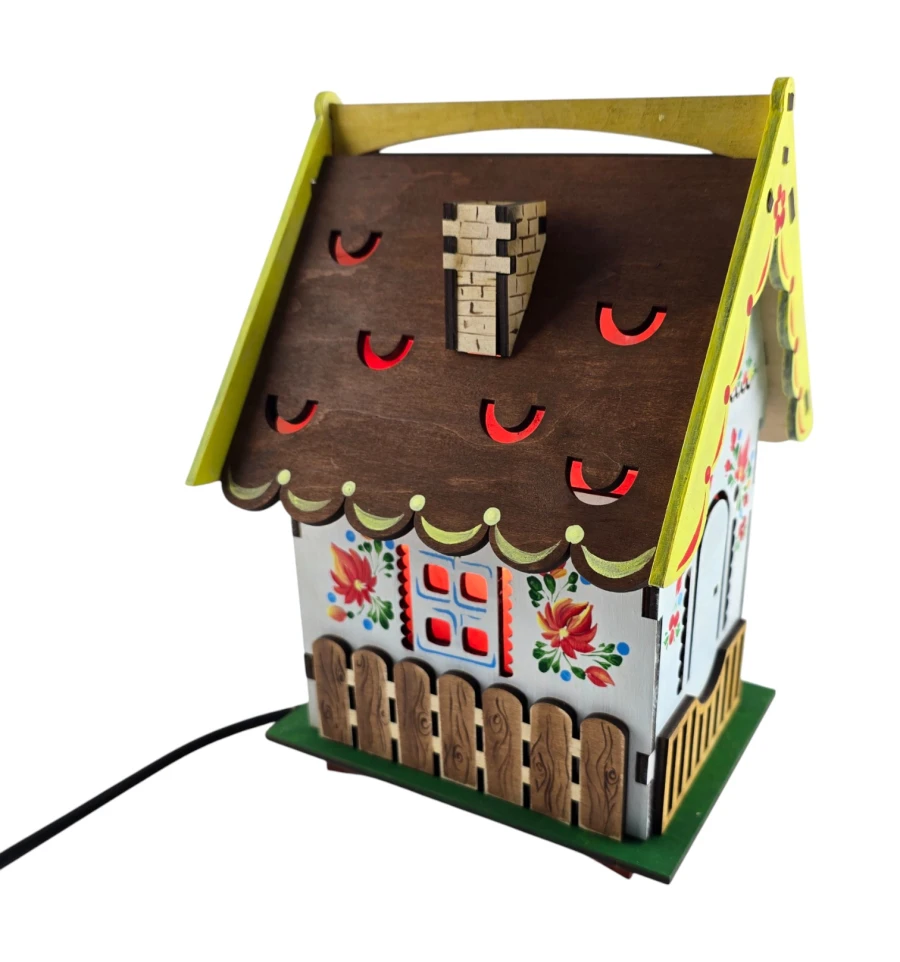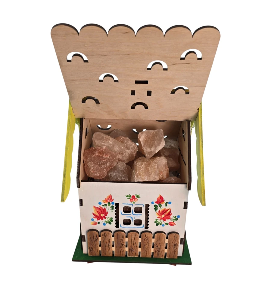 · Дизайн "Домик": Светильник выполнен в виде уютного домика из натурального дерева. Деревянный корпус украшен ажурной резьбой и яркой ручной росписью в народном стиле (цветочные мотивы, заборчик), что придает ему теплоту и сказочный вид. Открывающаяся крыша позволяет любоваться кристаллами соли.