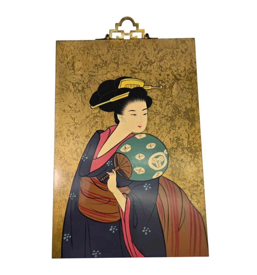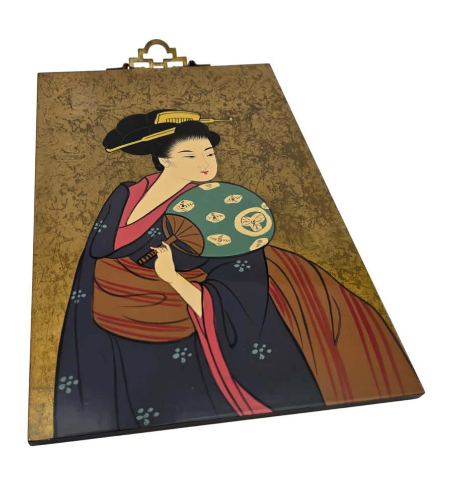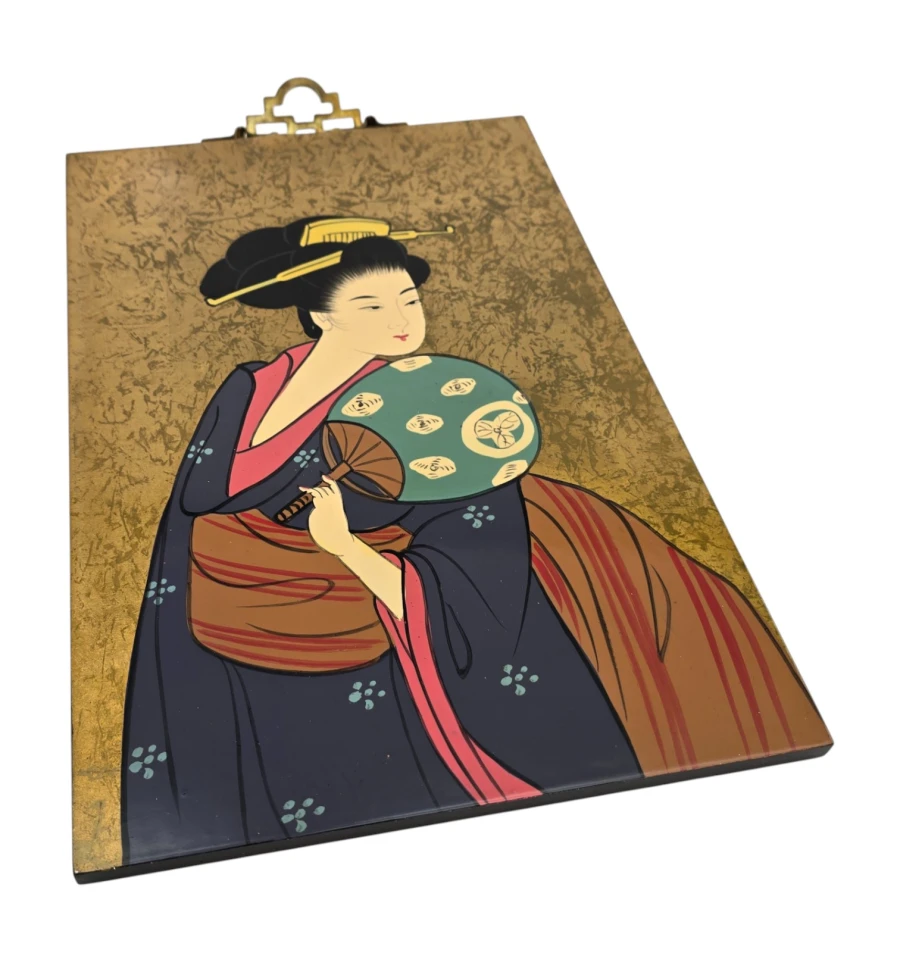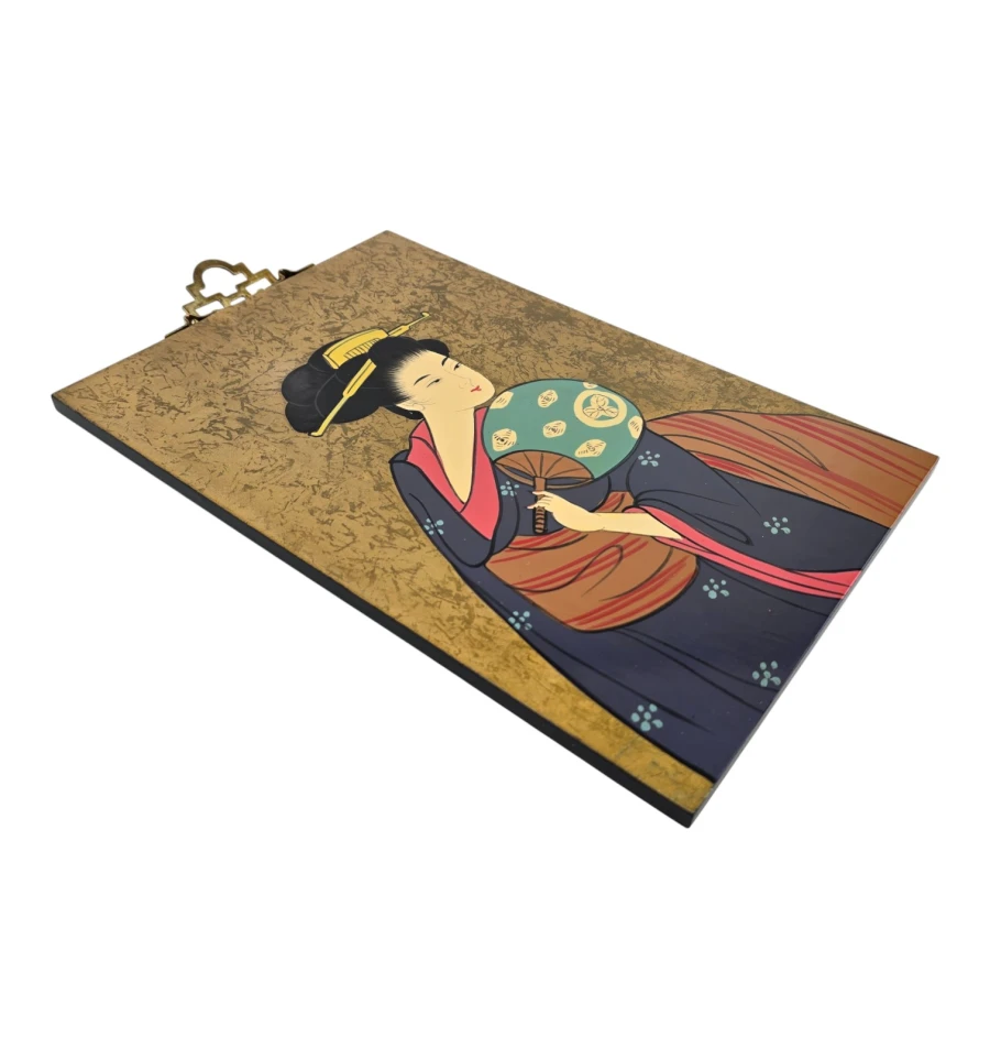 Настенное панно в японском стиле с изображением гейши с круглым веером. Традиционное кимоно спокойных оттенков и фон под золото создают атмосферу уюта и гармонии, поэтому панно легко вписывается и в современный, и в классический интерьер.