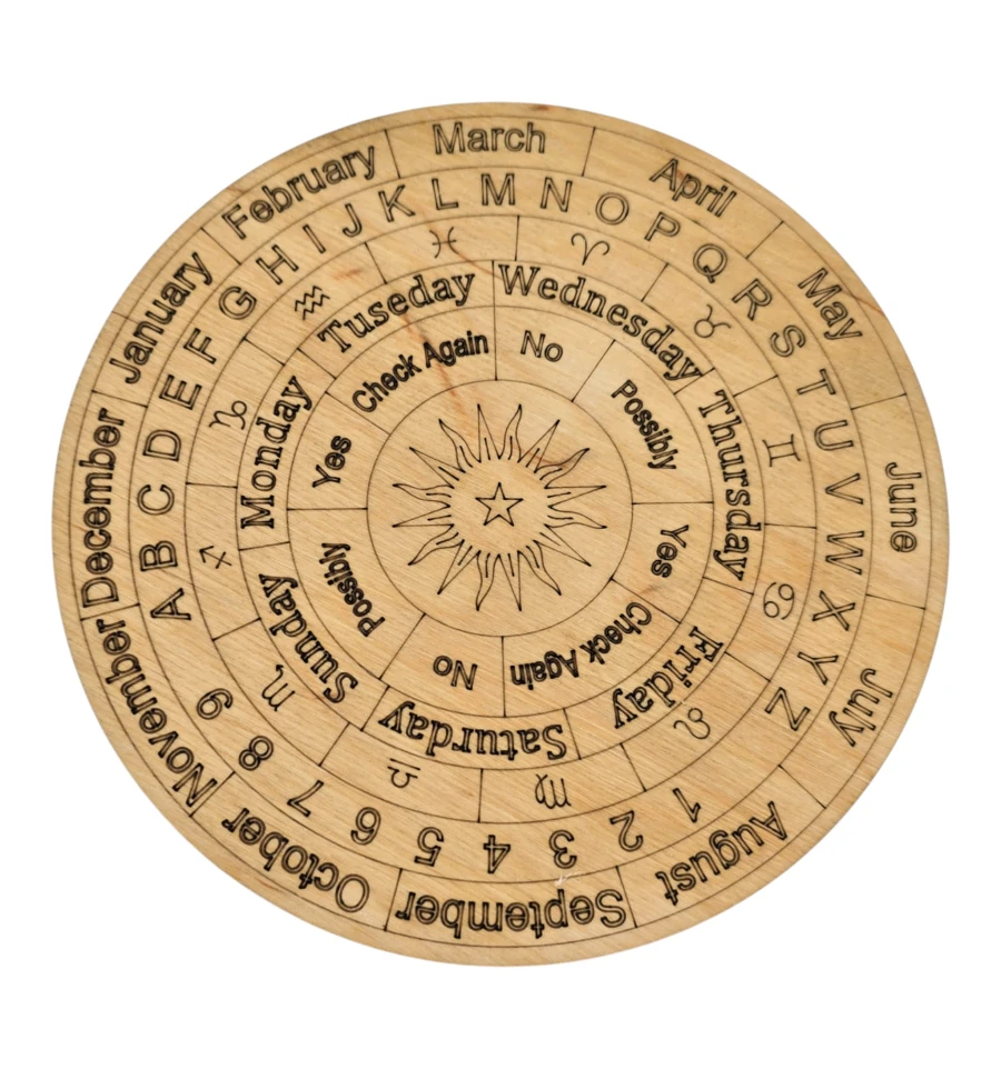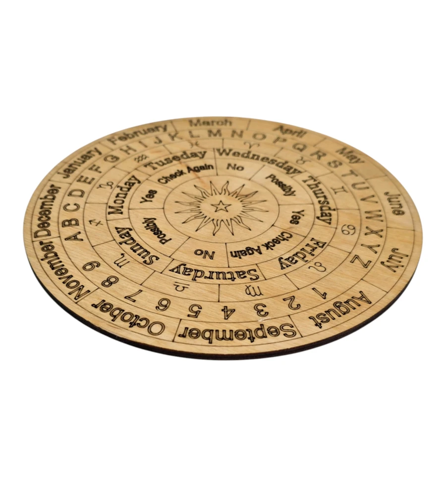 Круглая деревянная доска для работы с маятником, радиэстезии и метафизических практик. В центре расположен символ Солнца, вокруг — концентрические сектора с буквами алфавита, цифрами, месяцами, днями недели, а также ответами Yes / No / Maybe / Check Again и другими вариантами интерпретации.
