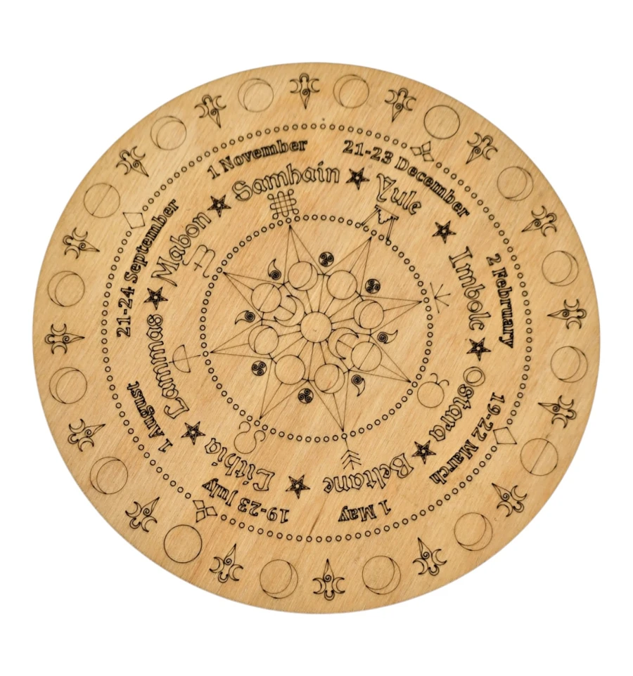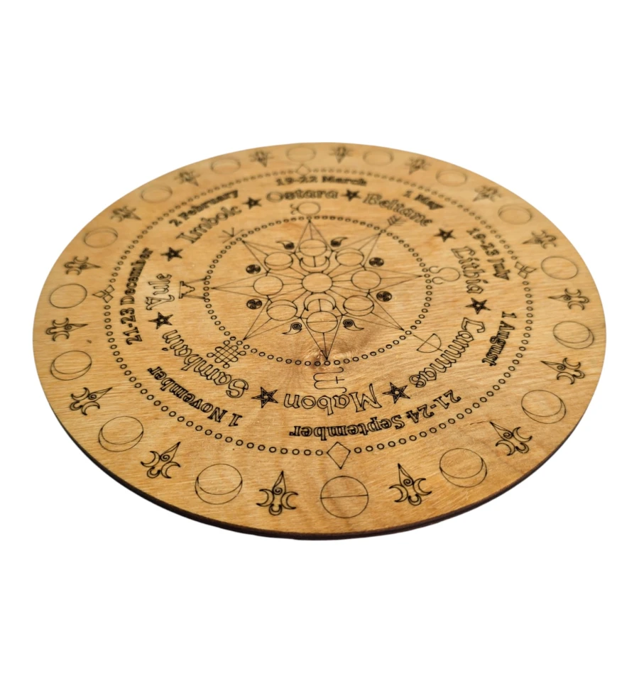 Круглая деревянная доска «Колесо Года» с детальной лазерной гравировкой, созданная для викканских практик, алтарей и медитативной работы. Изделие объединяет восемь годовых праздников (Sabbat): Yule, Imbolc, Ostara, Beltane, Litha, Lammas, Mabon и Samhain, а также лунные фазы, отражающие цикличность времени и природы.