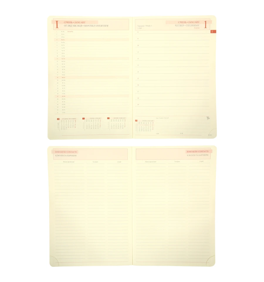 Бумажный блок продуман до мелочей для комфортного ежедневного использования. Он насчитывает 368 страниц, что обеспечивает достаточно пространства для ежедневных записей, планов и заметок. Бумага плотностью 80 г/м² позволяет комфортно писать ручкой либо карандашом без просвечивания. Кремовая бумага не утомляет глаза даже при длительной работе. Закругленные углы бумажного блока не только добавляют стильный вид, а и предотвращают быстрый износ страниц. Это практическое решение для сохранения делового планинга аккуратным в ежедневном использовании. Перфорированные углы бумажного блока позволяют легко маркировать актуальную страницу. Это удобный функциональный элемент, который позволяет быстро ориентироваться в записях и держать планирование под контролем. Фольгированный бумажный срез придает элегантный блеск и премиальный вид, что подчеркивает ваш статус и изысканный стиль вашего планера.