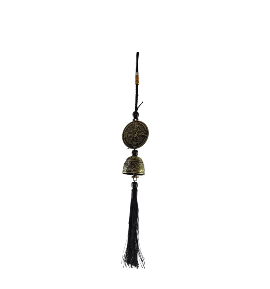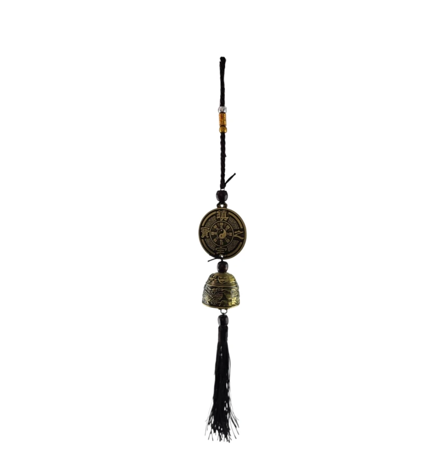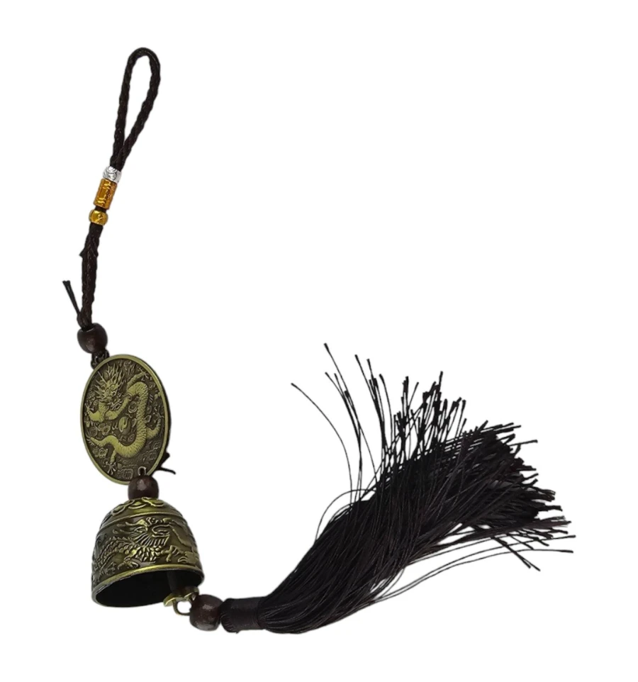 Центральным акцентом является металлический медальон с изображением китайского дракона с одной стороны и знака Инь-Янь с другой. Этот элемент символизирует равновесие и гармонию в жизни. Далее встречается деревянная бусина, за которой следует колокольчик, придающий подвеске нежный звук.