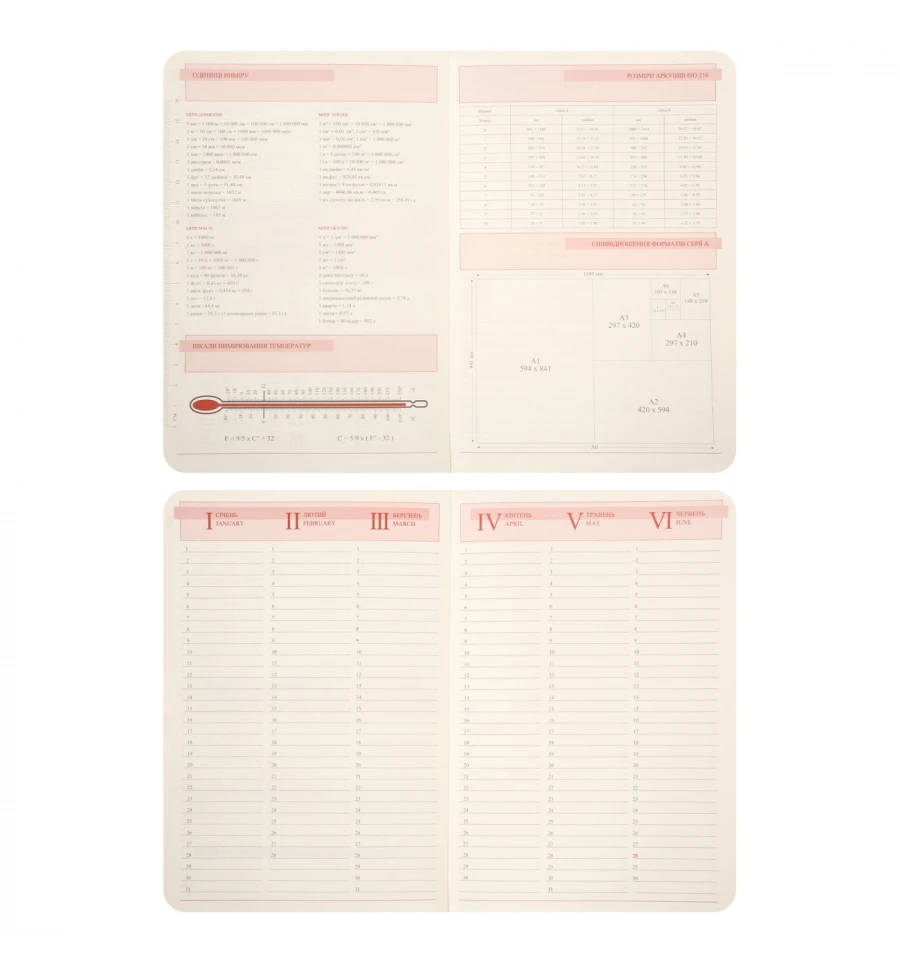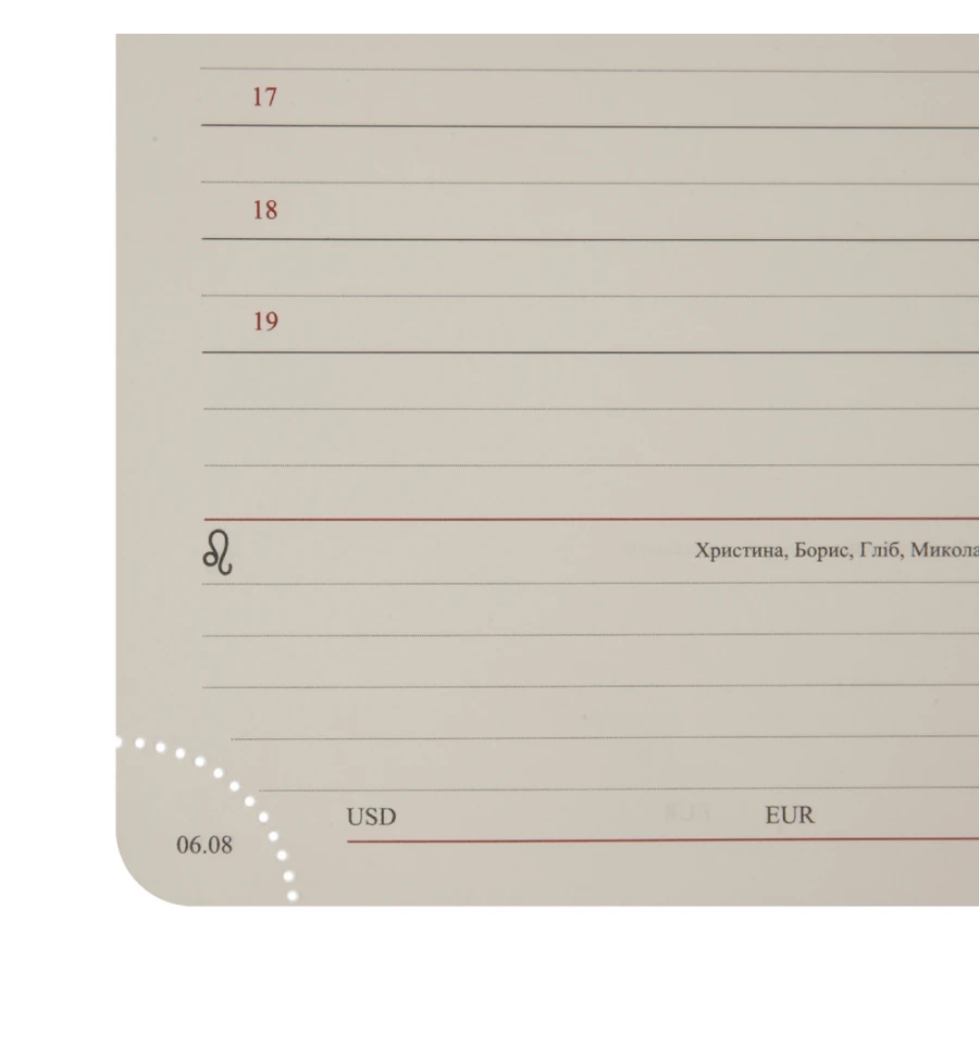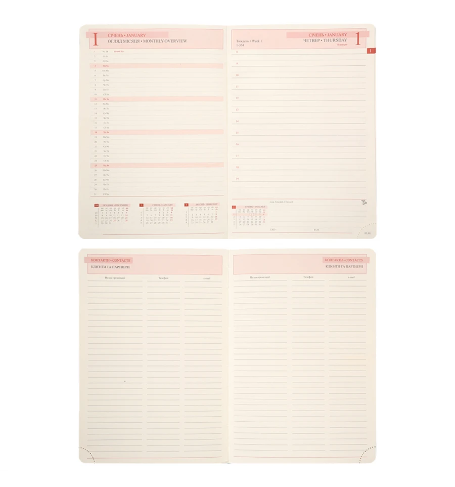 Бумажный блок продуман до мелочей для комфортного ежедневного использования. Он насчитывает 368 страниц, что обеспечивает достаточно пространства для ежедневных записей, планов и заметок. Бумага плотностью 80 г/м² позволяет комфортно писать ручкой либо карандашом без просвечивания. Кремовая бумага не утомляет глаза даже при длительной работе. Закругленные углы бумажного блока не только добавляют стильный вид, а и предотвращают быстрый износ страниц. Это практическое решение для сохранения делового планинга аккуратным в ежедневном использовании. Перфорированные углы бумажного блока позволяют легко маркировать актуальную страницу. Это удобный функциональный элемент, который позволяет быстро ориентироваться в записях и держать планирование под контролем. Фольгированный бумажный срез придает элегантный блеск и премиальный вид, что подчеркивает ваш статус и изысканный стиль вашего планера.