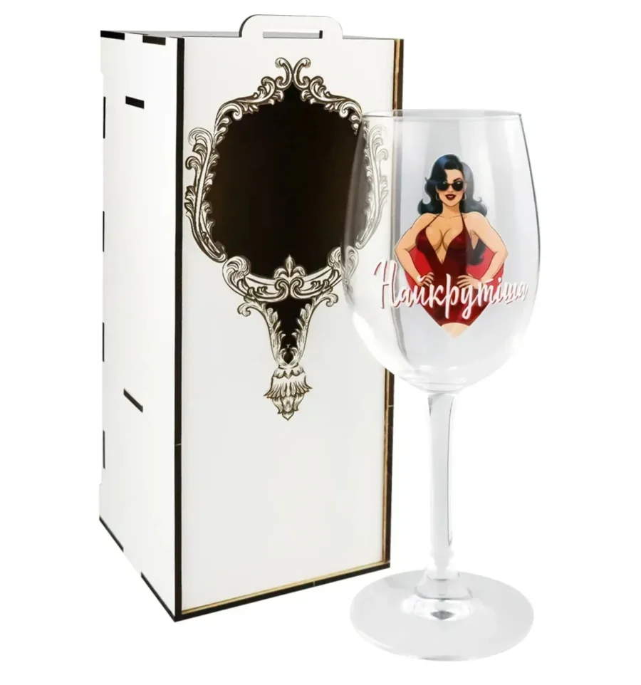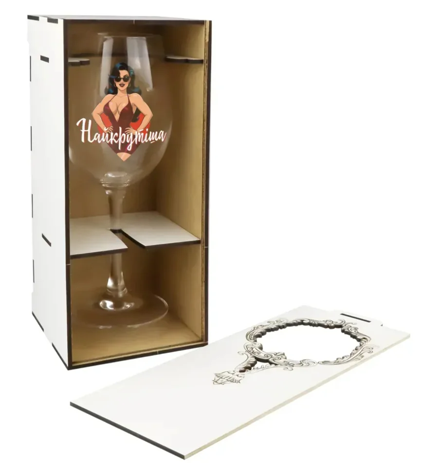 Стильный подарочный набор, сочетающий винный бокал 360 мл и прочную фанерную коробку. Отличное решение для подарка или личной коллекции.