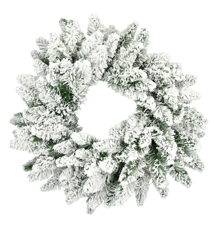 Пышный заснеженный венок – традиционный подвесной декор для входных дверей дома и офиса в период новогодних праздников. Рождественский венок можно украшать зимними ягодами, веточками, пуансеттией, елочными шарами и другим декором. Все используемые материалы экологически чистые, имеют противопожарные свойства. Высокое качество материала позволяет изделию быть не только оригинальным и красивым, а еще и долговечным. Материал: ПВХ плёнка зелёного цвета, проволока. Ширина хвои — 8,5 см. Диаметр: 70 см.