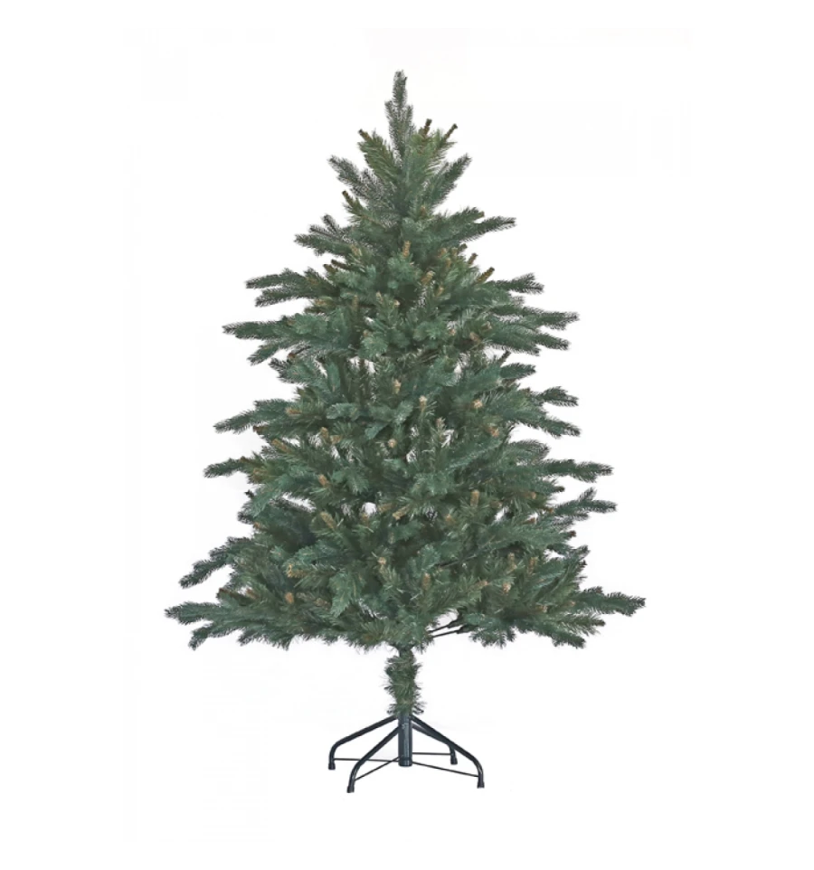 Искусственная ель с литыми ветками максимально подобна натуральному дереву. Все используемые материалы экологически чистые, имеют противопожарные свойства. Большим плюсом искусственной елки является её долговечность, а сборка конструкции не отнимет много времени. Красивое и пышное новогоднее дерево будет ежегодно наполнять дом радостью и благополучием в рождественский период. Материал: ПВХ пленка шириной 8,5 см; литые ветки; металл; проволока. Высота: 120 см. Диаметр нижнего ряда: 90 см. Ствол ели состоит из двух частей. Подставка ели — это металлическая крестовина с болтами, закрепляющими ствол. Габариты: 1,20 м.