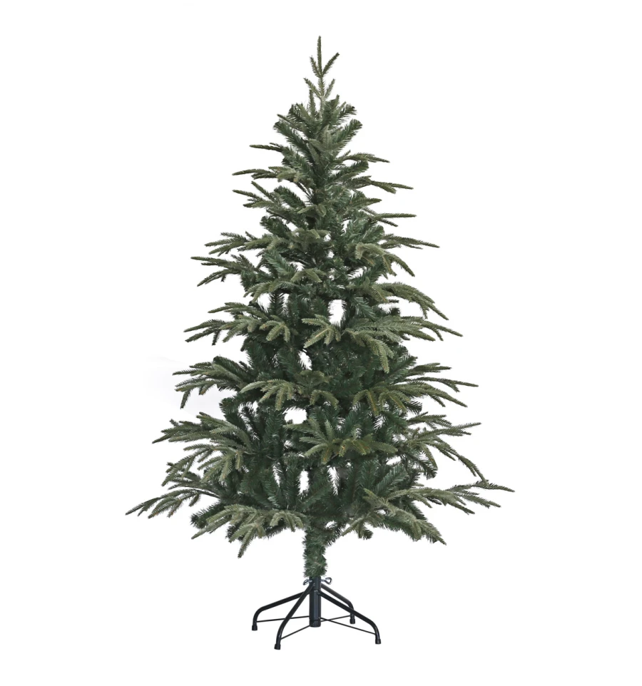 Искусственная ель с литыми ветками максимально подобна натуральному дереву. Все используемые материалы экологически чистые, имеют противопожарные свойства. Большим плюсом искусственной елки является её долговечность, а сборка конструкции не отнимет много времени. Красивое и пышное новогоднее дерево будет ежегодно наполнять дом радостью и благополучием в рождественский период. Материал: ПВХ пленка шириной 6 см; литые ветки; металл; проволока. Высота: 150 см. Диаметр нижнего ряда: 104 см. Ствол ели состоит из двух частей. Подставка ели — это металлическая крестовина с болтами, закрепляющими ствол. Габариты: 1,50 м.