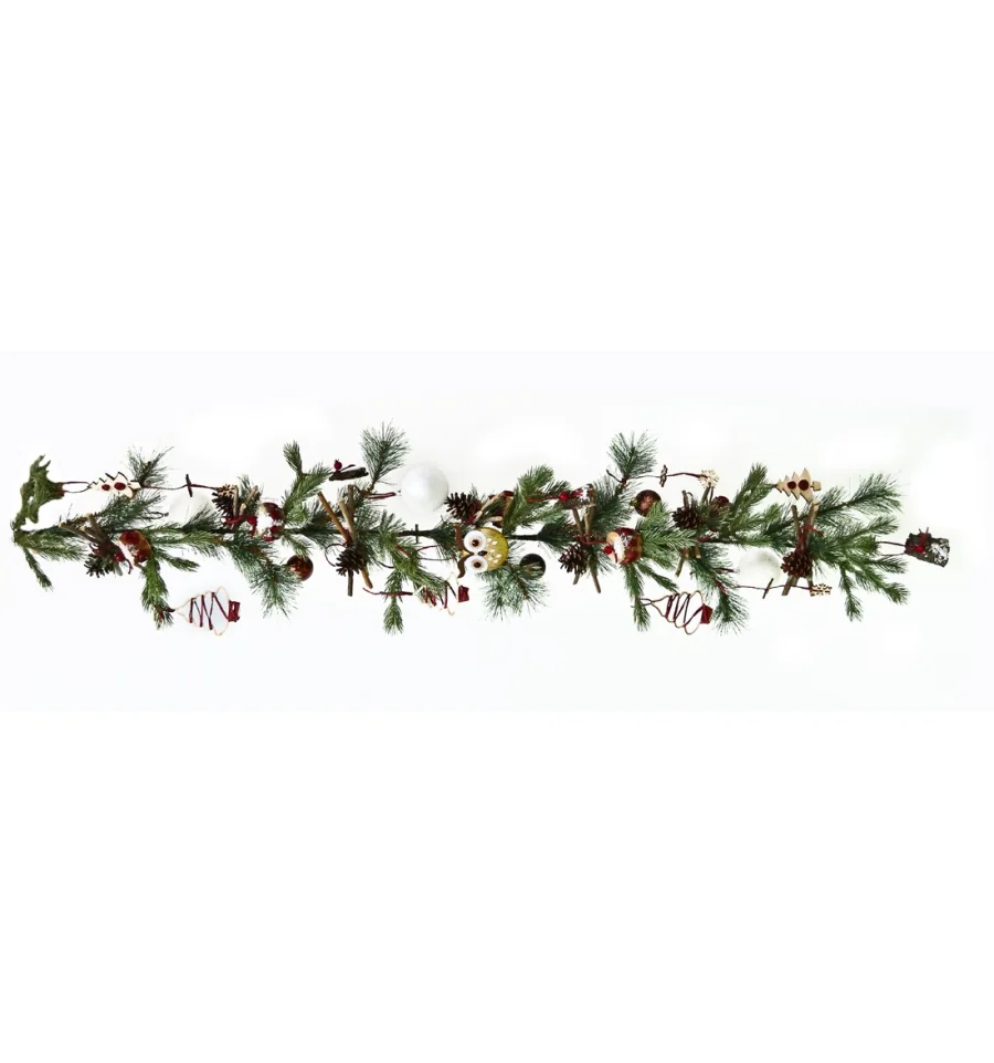 Невероятная искусственная еловая ветка послужит прекрасным подвесным декором в украшении интерьера в период новогодних и рождественских праздников. Гармонично подобранные аксессуары в виде игрушек совушек, фанерных фигурок, палочек, пеньков, декорированных рафией, подарят настроение таинственного волшебства. Такой декор несомненно подчеркнет атмосферу праздника в доме и офисе. Материал: ПВХ пленка шириной по 10 см; проволока. Длина: 150 см.