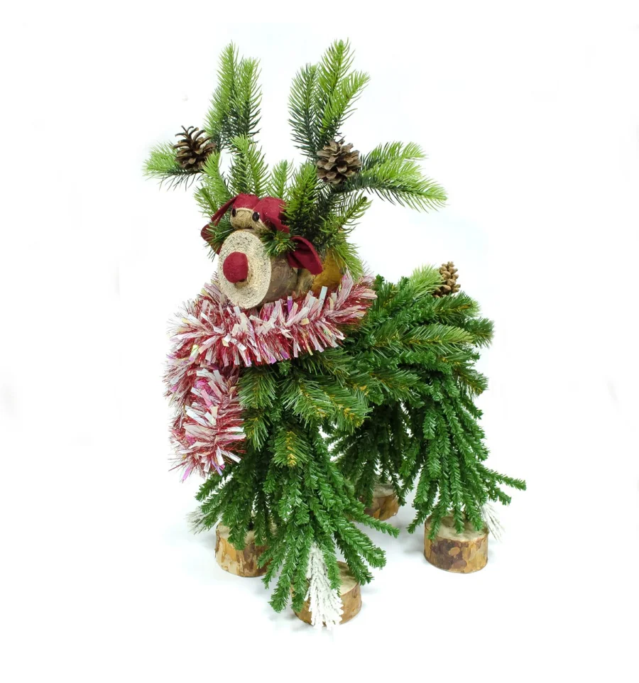 Праздничный Олень будет ожидать Вас у порога дома либо при входе в помещение, либо, как вариант для размещения — у подножия новогодней ели. Нестандартное исполнение оленя из еловых искусственных веток, натуральных шишек и дерева позволяет размещать его как в помещении, так и на улице, а стильный шарф уж точно не даст ему замерзнуть. Высота изделия: 60 см, ширина изделия: 40 см.