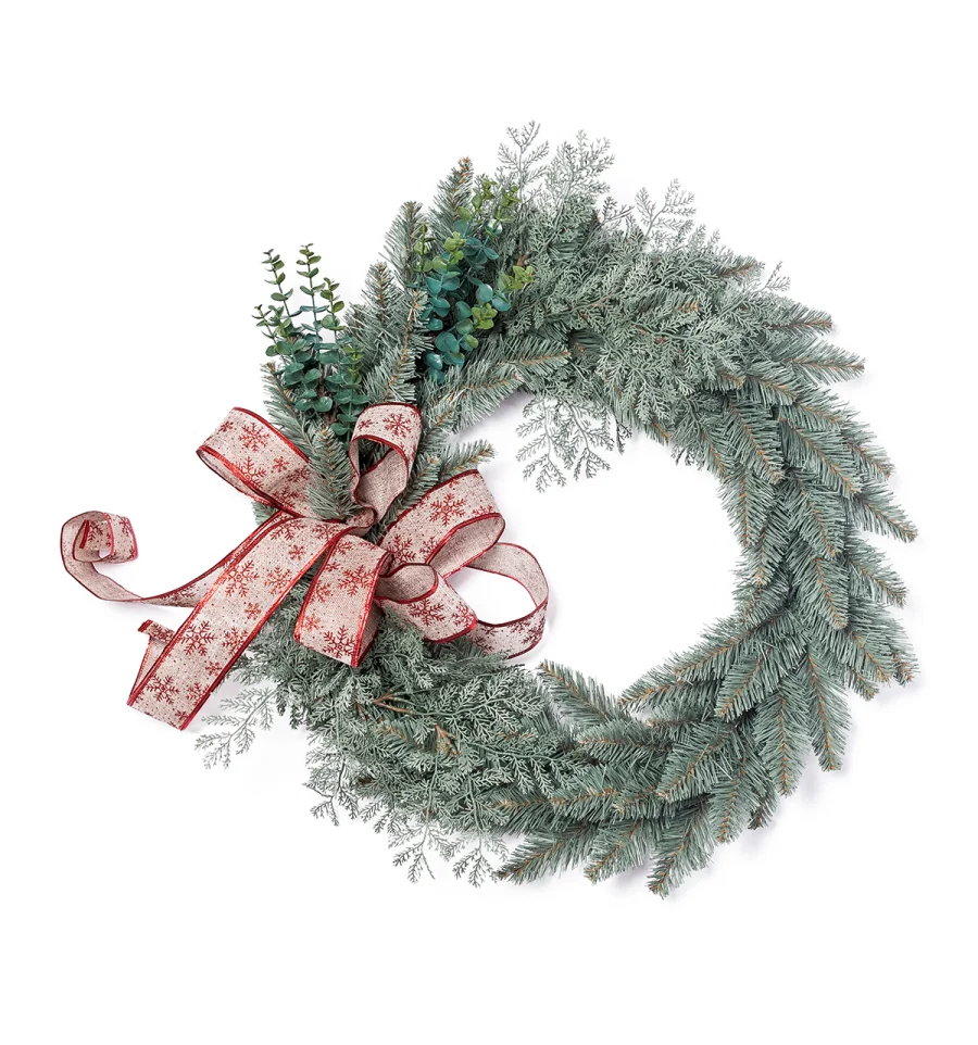 Оригинальный венок с красивыми ветками, украшенный рождественской лентой станет прекрасным декором для входных дверей дома, офиса в период новогодних праздников. Высокое качество материала способствует долговечности изделия. Материал: ПВХ плёнка голубого цвета, литые веточки, проволока. Ширина хвои — 8,5 см. Диаметр: 50 см.