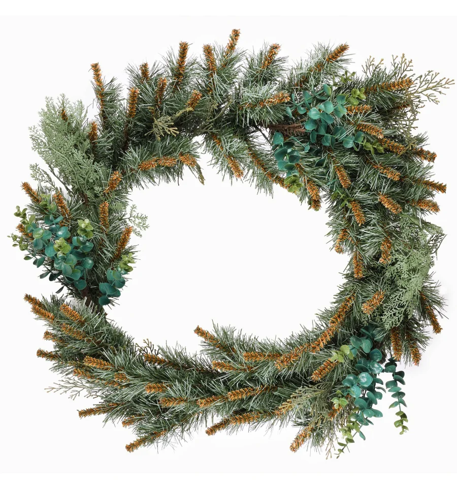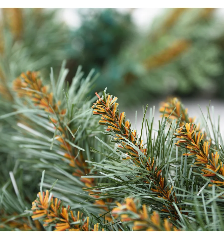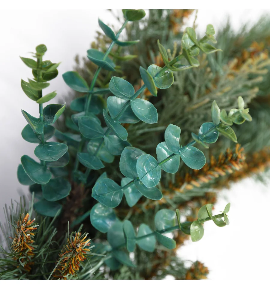 Оригинальный венок с красивыми ветками станет прекрасным декором для входных дверей дома, офиса в период новогодних праздников. Рождественский венок можно дополнительно украшать зимними ягодами, пуансеттией, елочными шарами и другим декором. Все используемые материалы имеют противопожарные свойства. Высокое качество материала способствует долговечности изделия. Материал: ПВХ плёнка зелёно-голубого цвета, литые веточки, проволока. Ширина хвои — 60 см. Диаметр: 50 см.