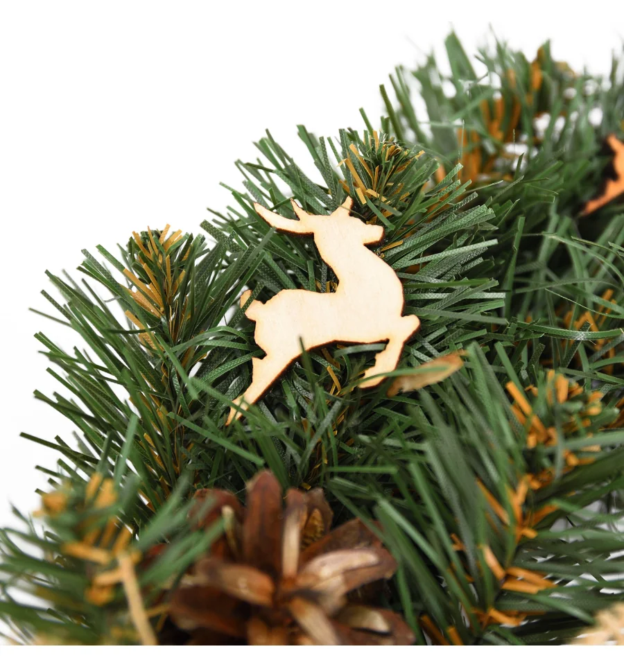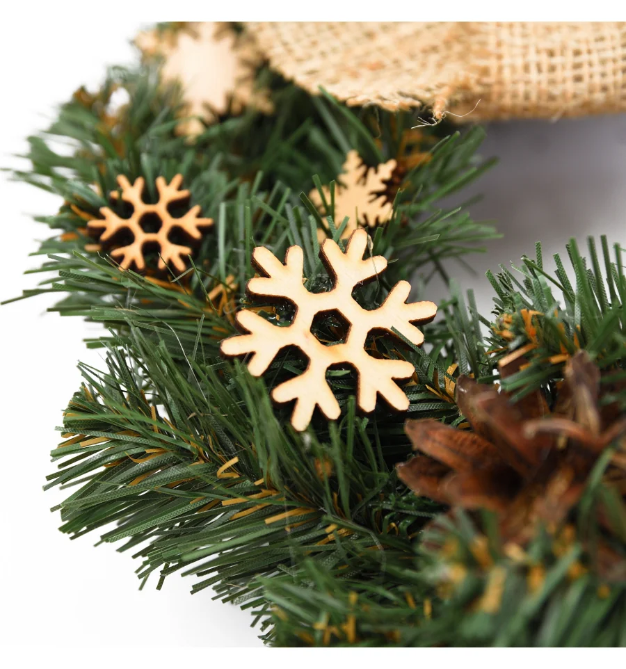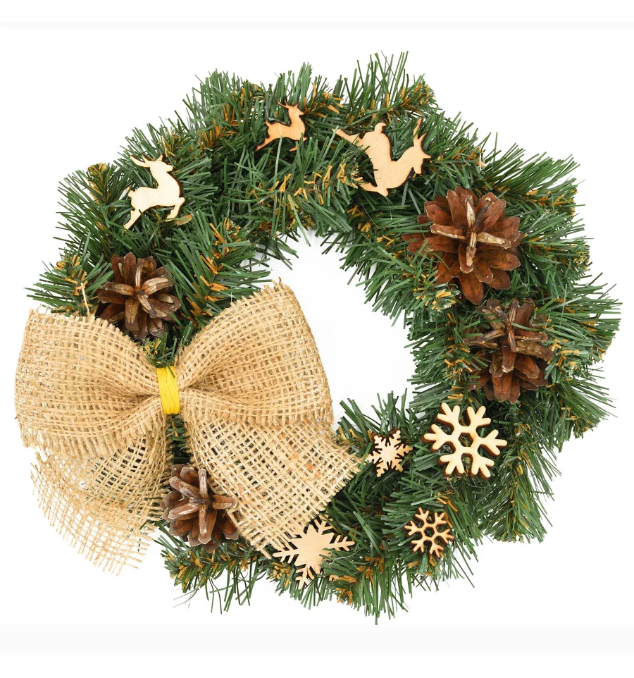 Оригинальный венок с аксессуарами станет прекрасным декором для входных дверей дома и офиса в период новогодних праздников. Рождественский венок можно украшать зимними ягодами, веточками, пуансеттией, елочными шарами и другим декором. Все используемые материалы экологически чистые, имеют противопожарные свойства. Высокое качество материала позволяет изделию быть не только оригинальным и красивым, а еще и долговечным. Материал: ПВХ плёнка зелёного цвета, проволока. Ширина хвои — 6 см. Диаметр: 17,5 см.