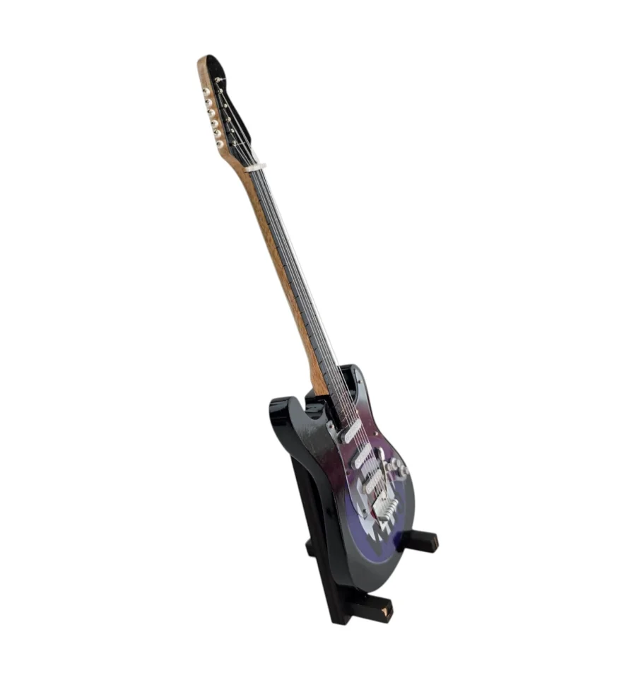 Изготовлена вручную из натурального дерева мастерами Индонезии. Чёрный глянцевый корпус с фиолетово-синим принтом. Фурнитура (колки, звукосниматели, бридж, лады) — пластик, окрашенный под металл. Реалистичные тонкие струны.