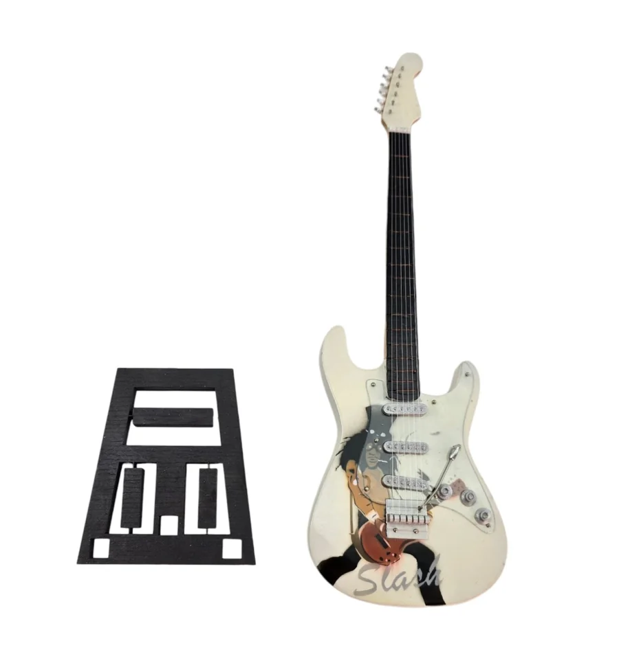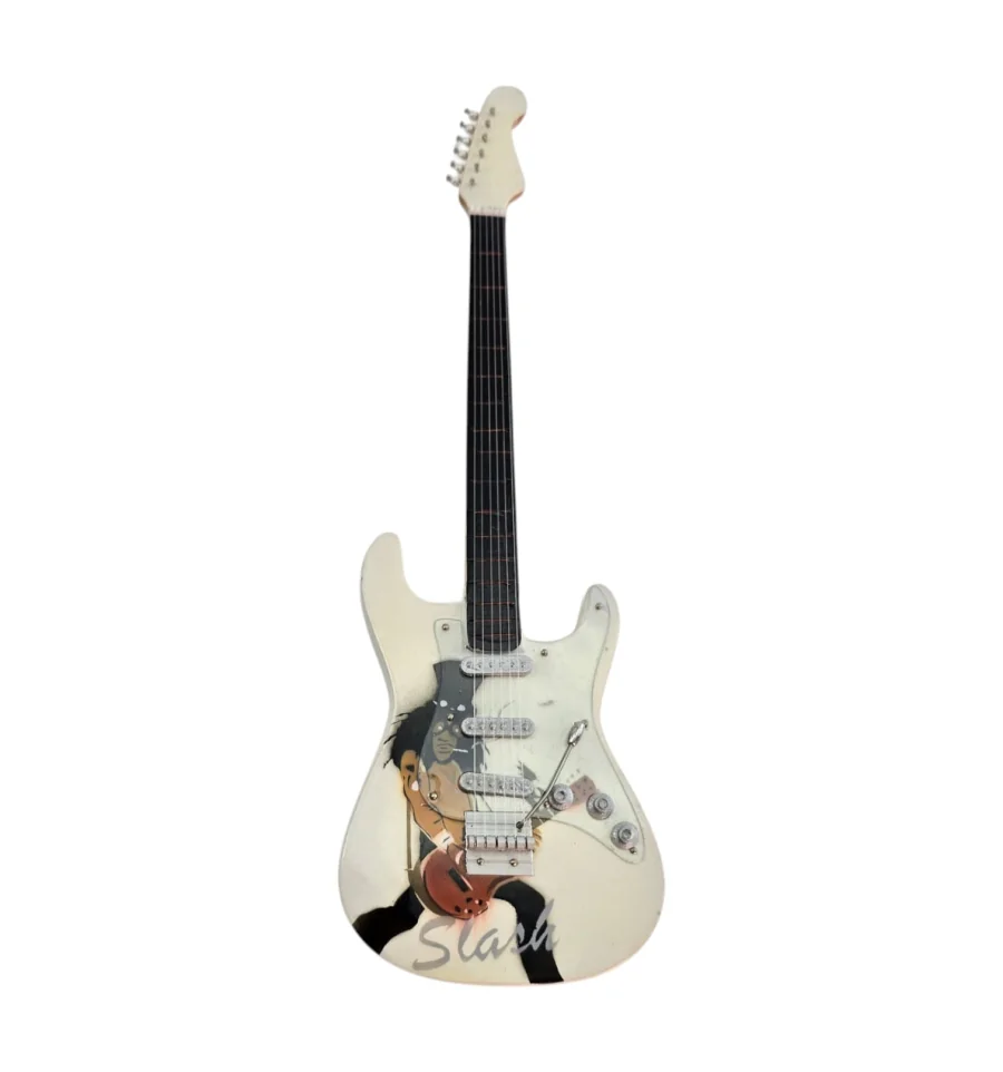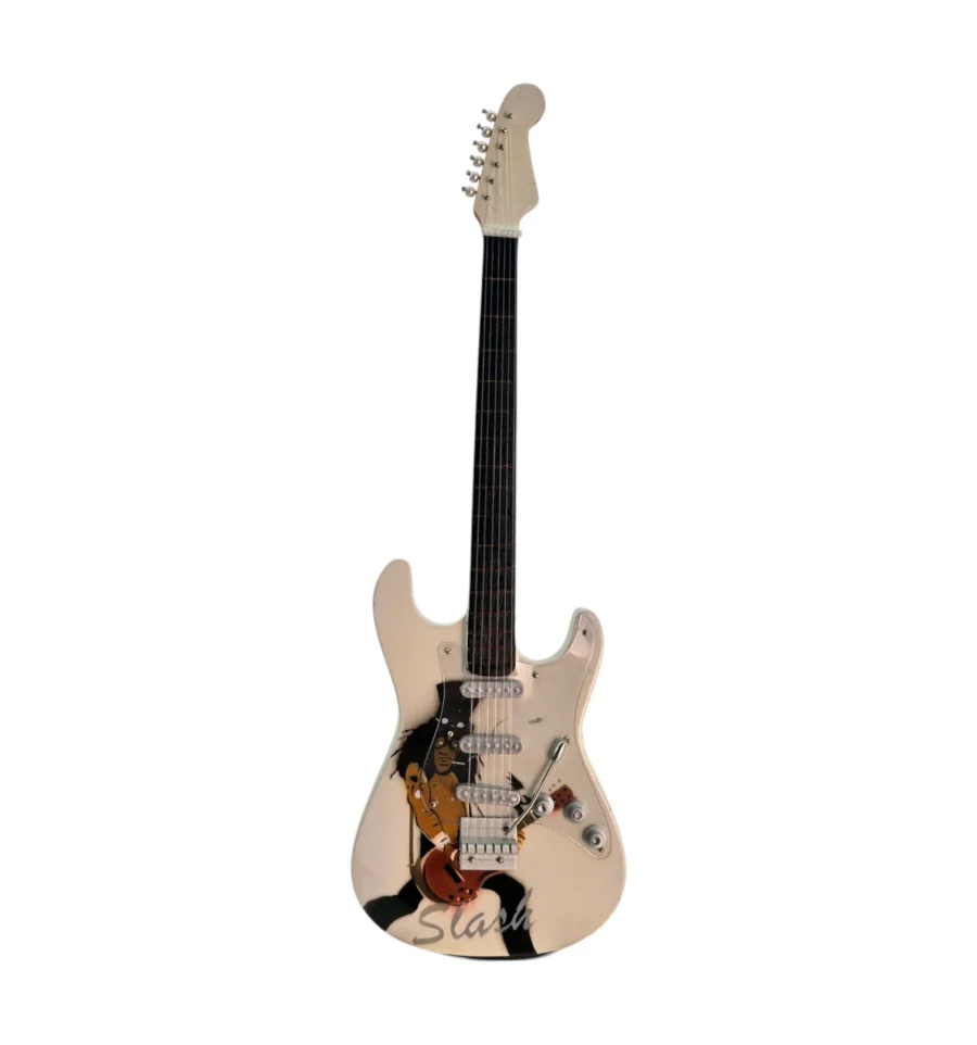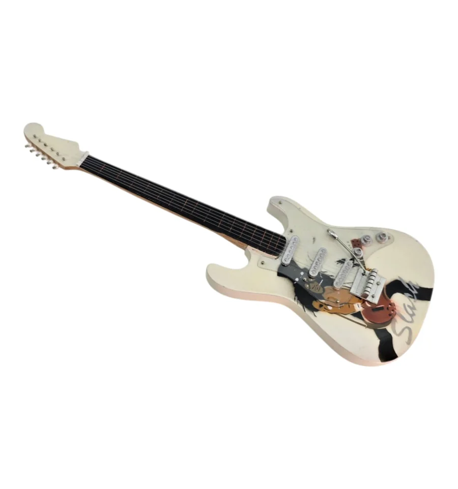 Декоративная мини-гитара в стиле Slash — с портретом легендарного гитариста Guns N' Roses и его фирменной подписью.