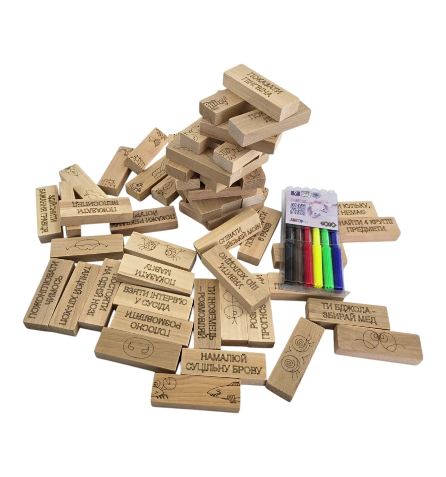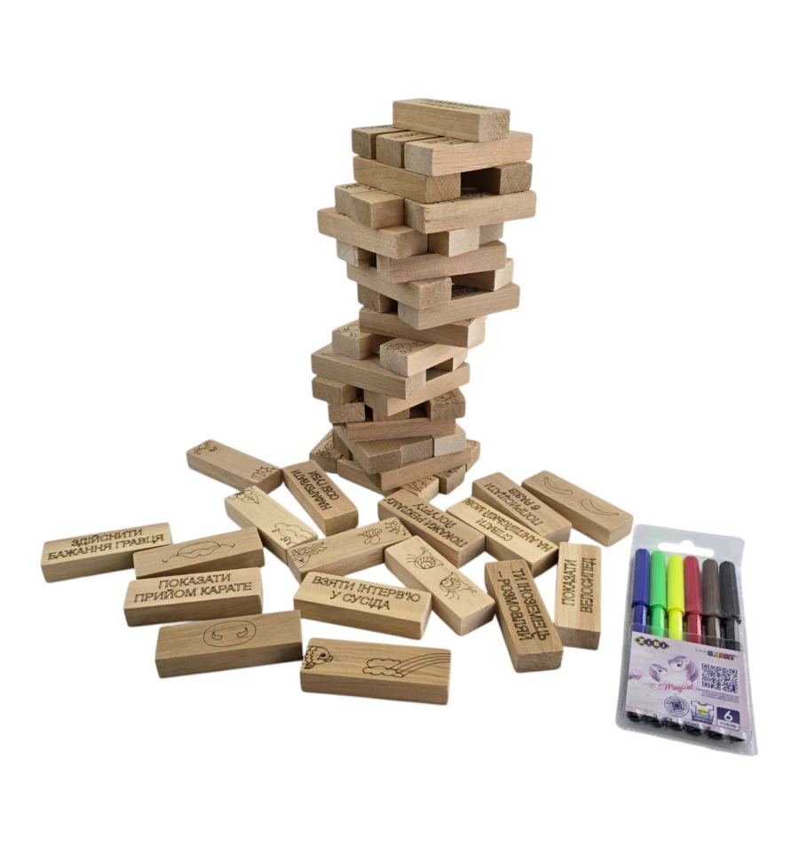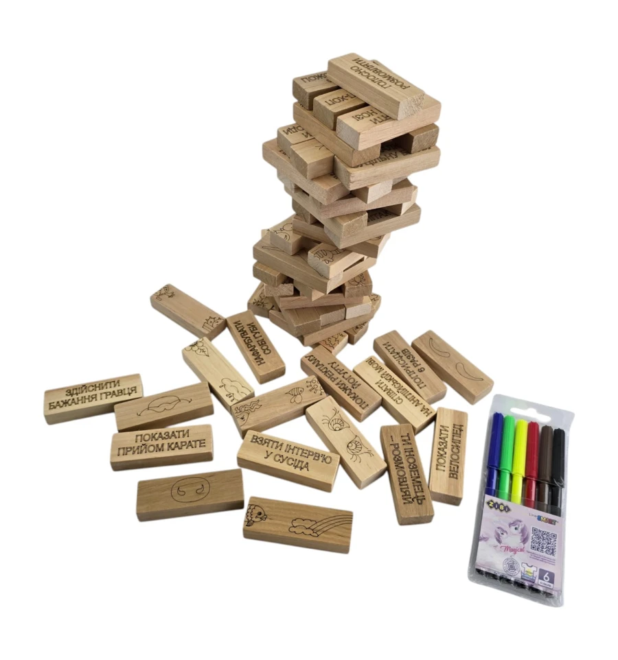 Веселые Фанты: На гранях выгравированы задания («Показать карате», «Замереть в позе»). Тяните блок и превращайте вечер в веселое шоу!