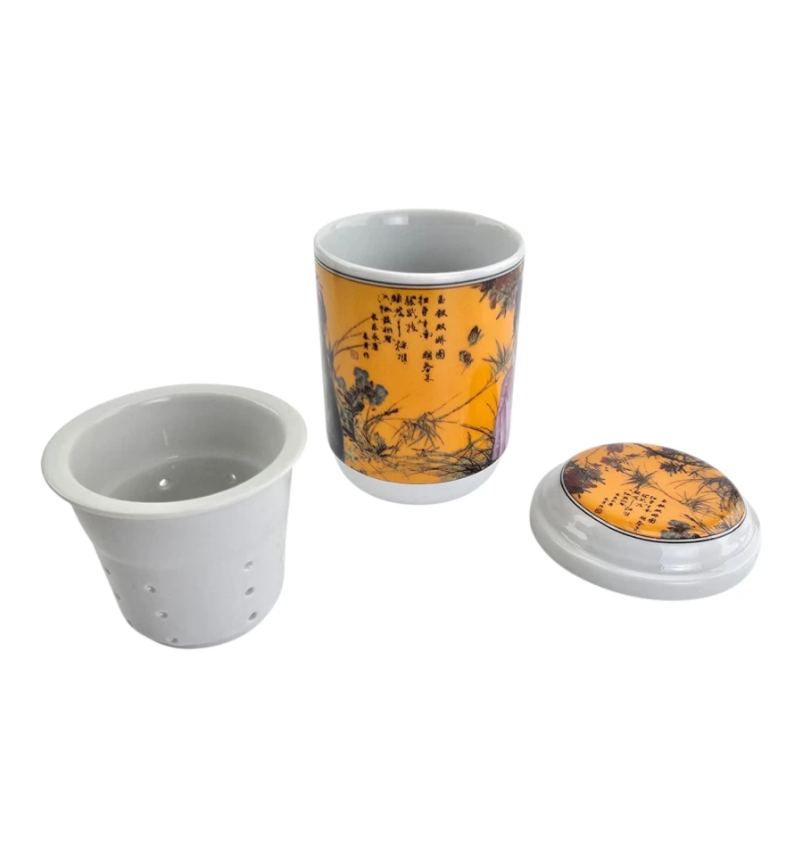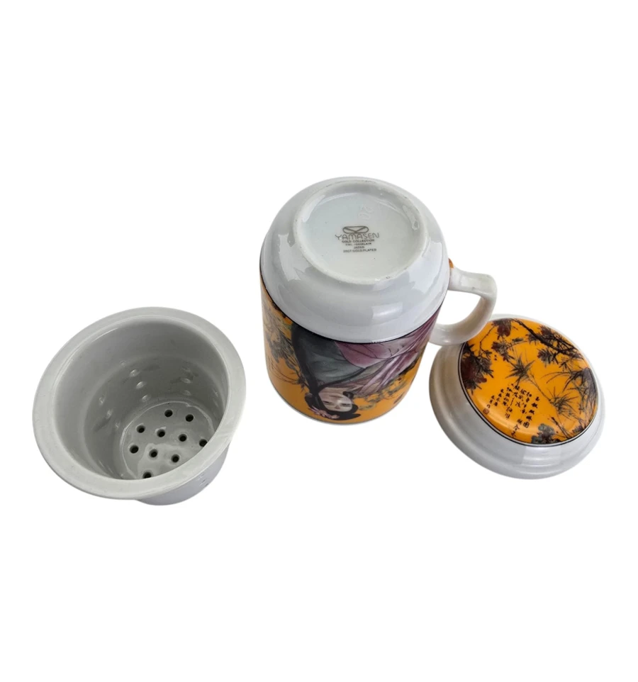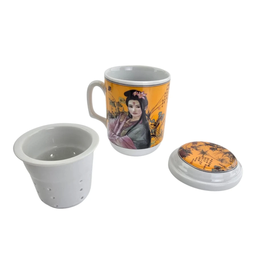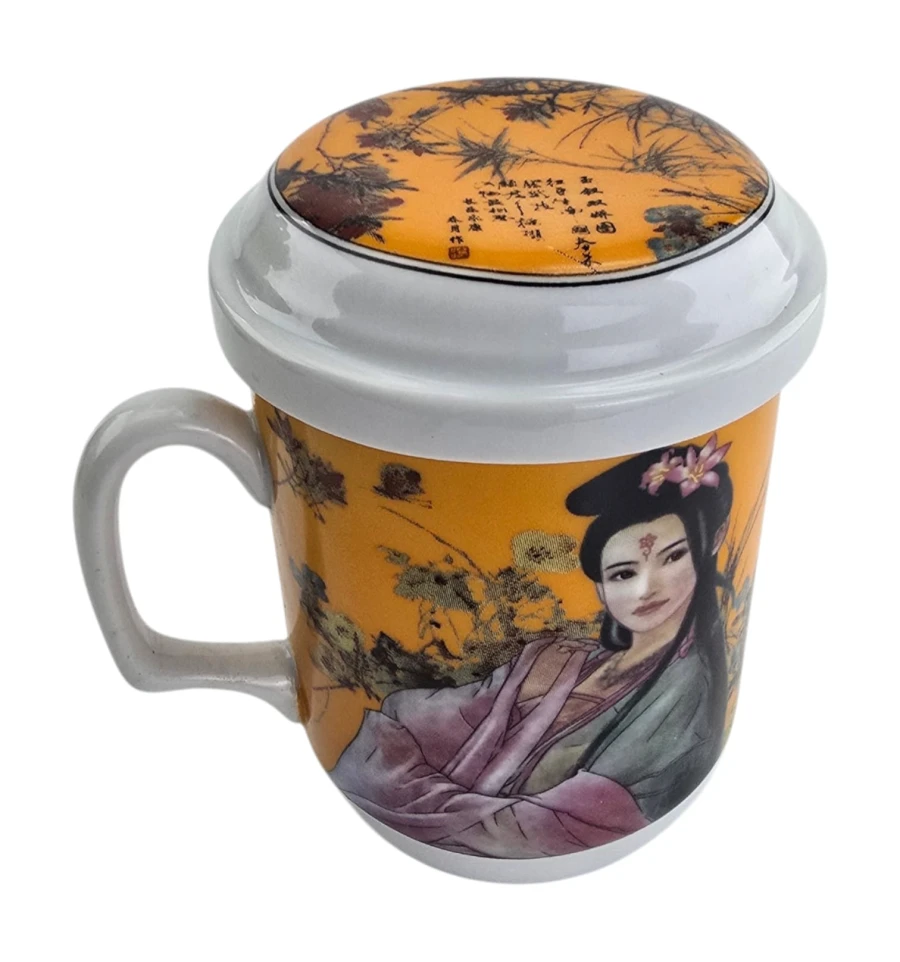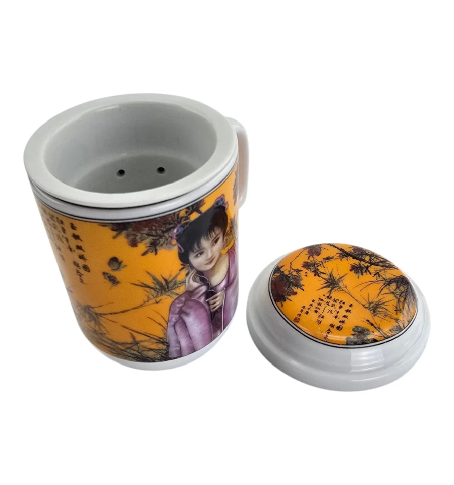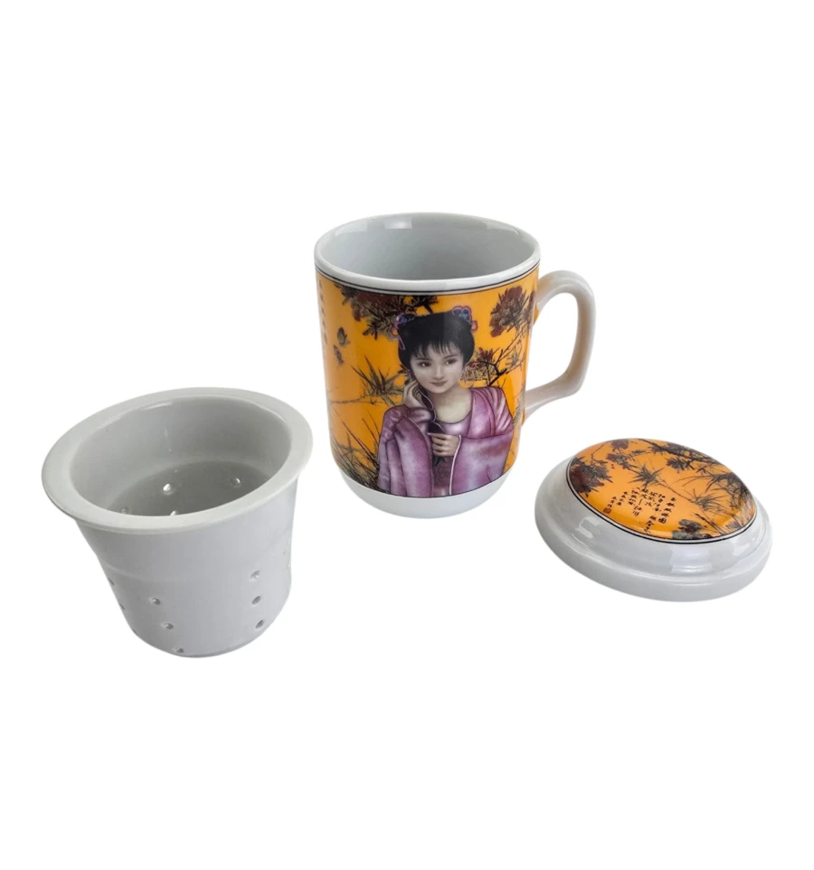 кружка заварочная, кружка с ситечком, кружка с крышкой, фарфоровая кружка, чайная кружка, кружка для чая, ситечко для чая, инфузер, чайная посуда, YAMASEN, кружка 230 мл, китайские девушки, желтая кружка, двусторонний рисунок, китайский стиль