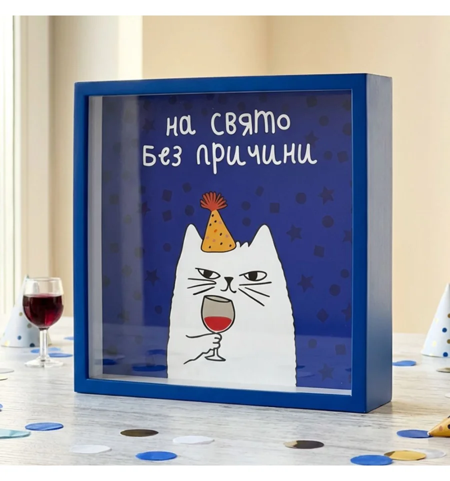 Оригинальная копилка для денег выполнена из дерева и пластика с забавным принтом.