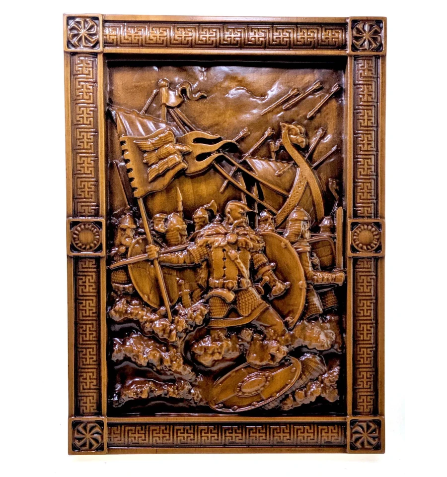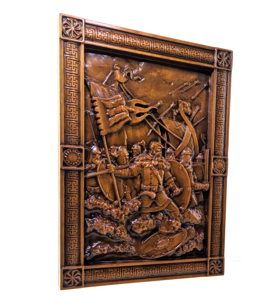 Панно «Святослав», резное, отделанное патиной и лаком (28.5×27.5×2.4 см) массив дерева