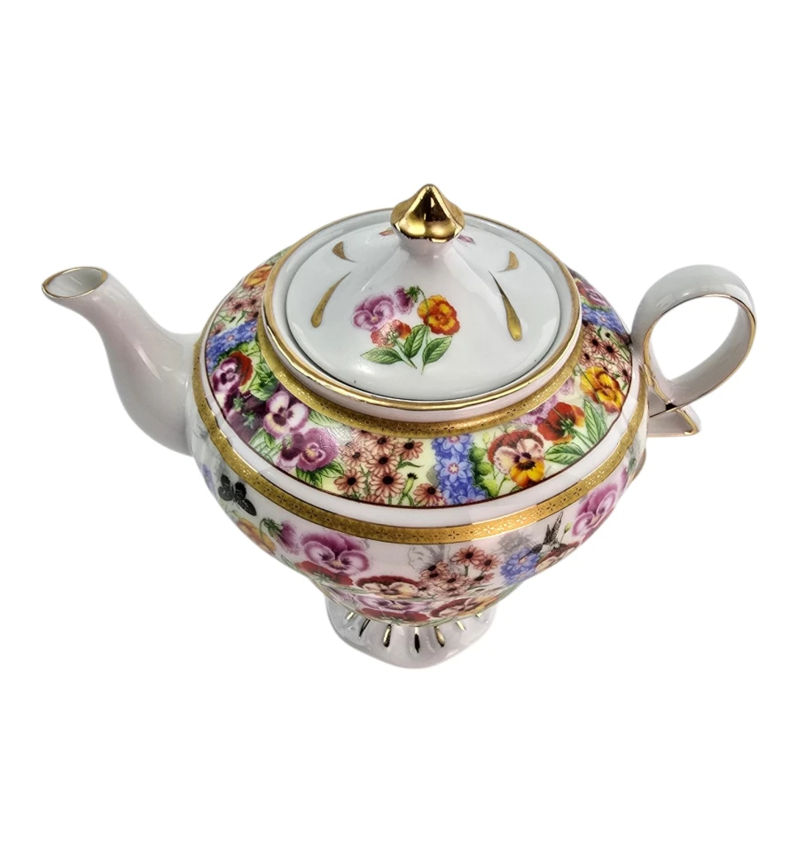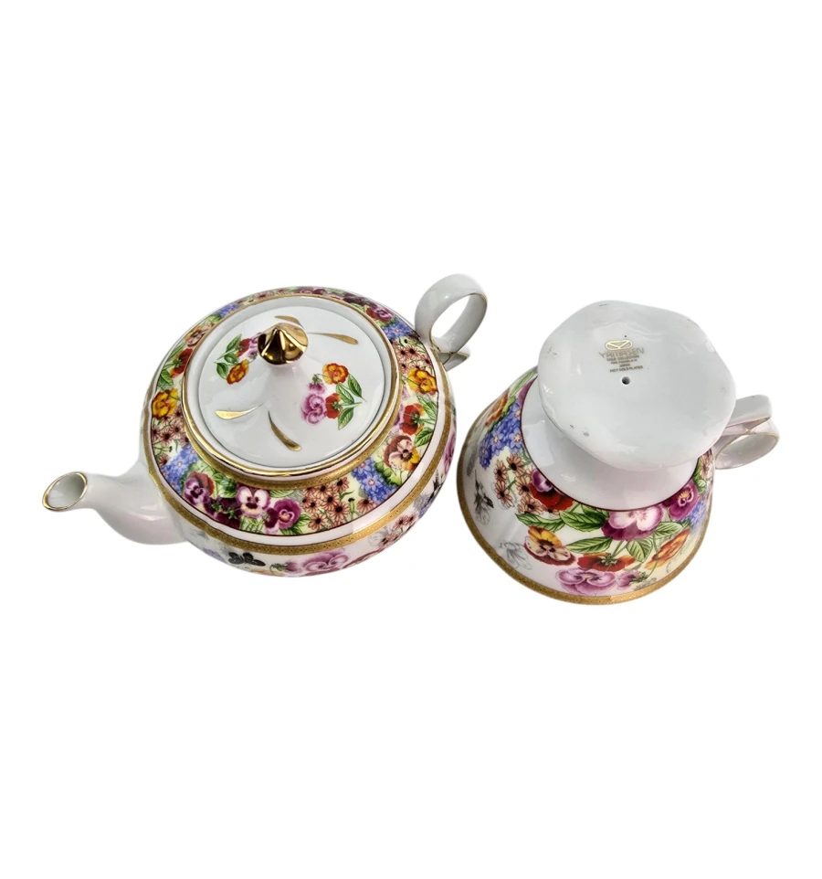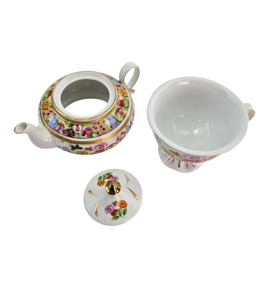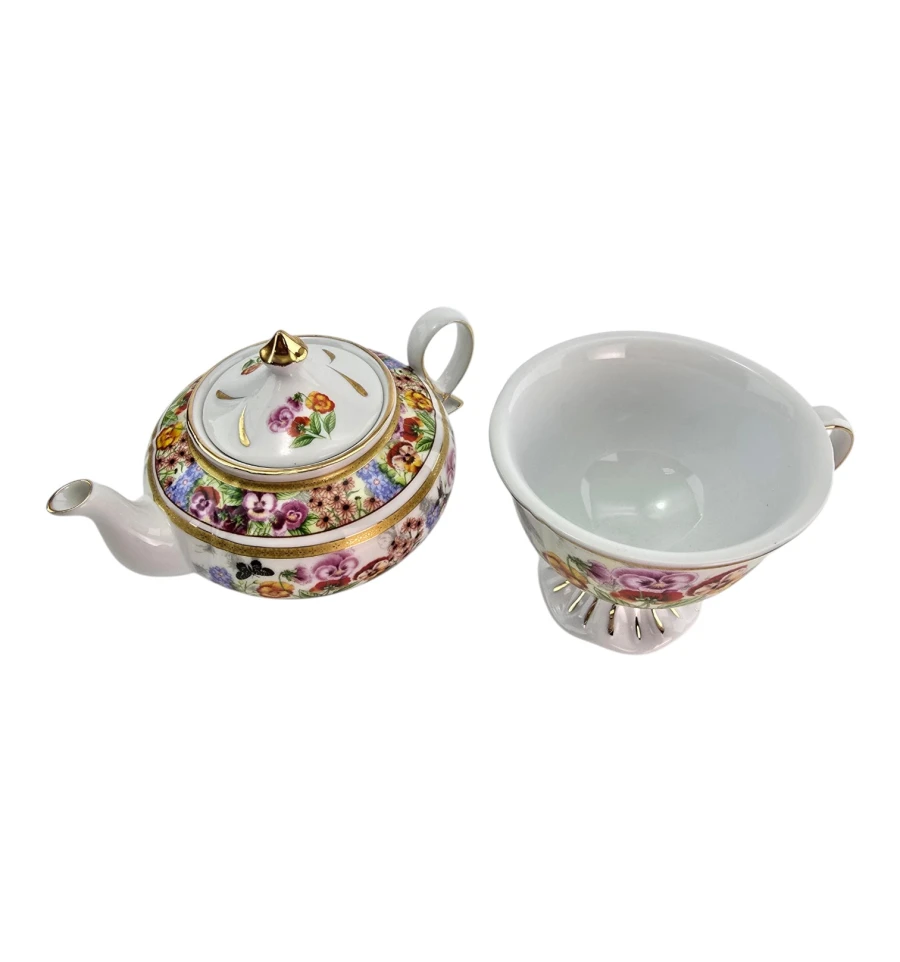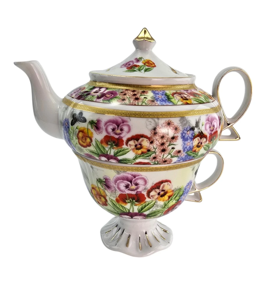 Чайник и чашка украшены ярким цветочным рисунком: крупные анютины глазки, полевые цветы, бабочки и колибри на белом фоне. По краям — золотые ободки. Чашка стоит на фигурной ножке с золотыми лучами. Чайник имеет удобную ручку, носик и крышку с золотой кнопкой.