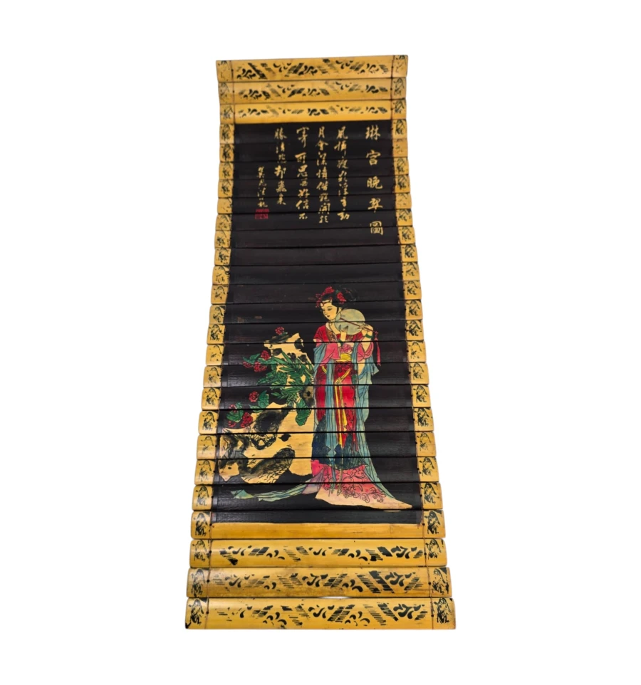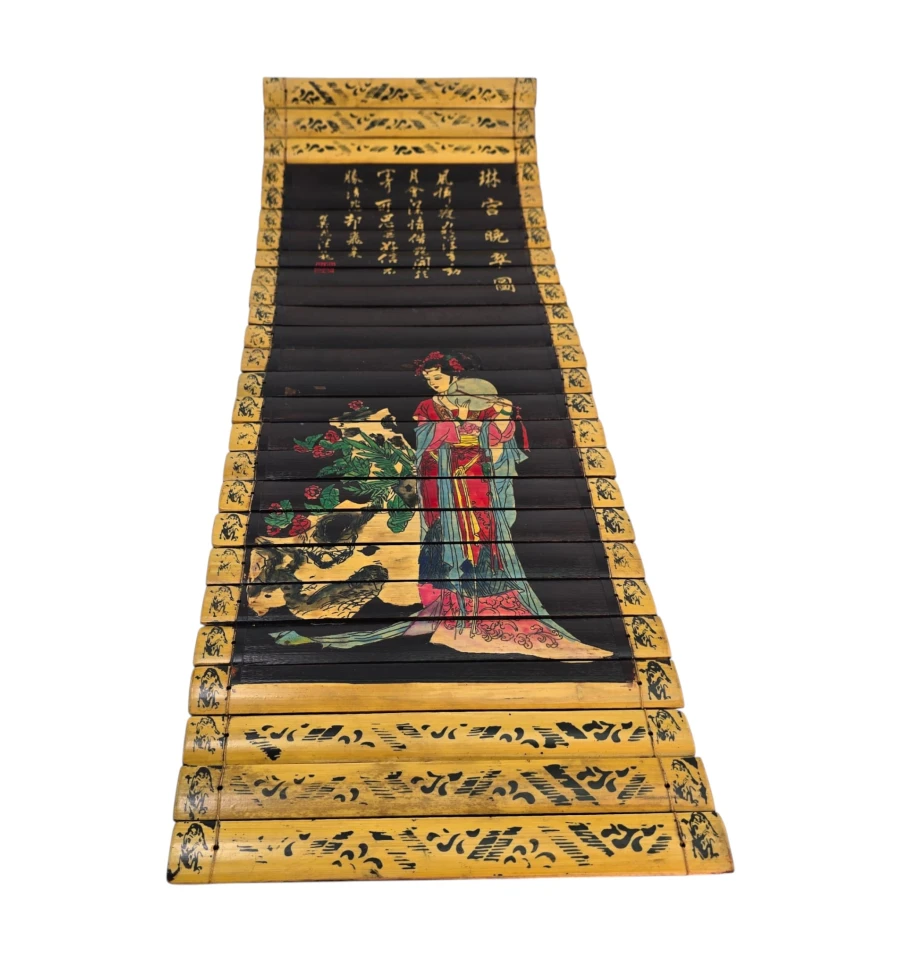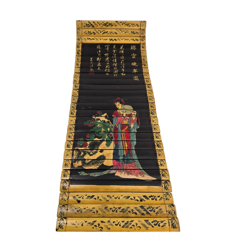 Центральная часть глубокого чёрного цвета украшена яркой художественной композицией: изображена утончённая китайская красавица в богатом красном и голубом наряде. Она стоит рядом с декоративным камнем и цветами (пионами), создавая гармоничную восточную сцену.