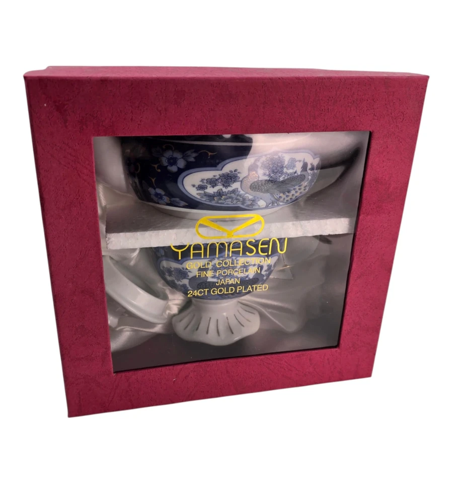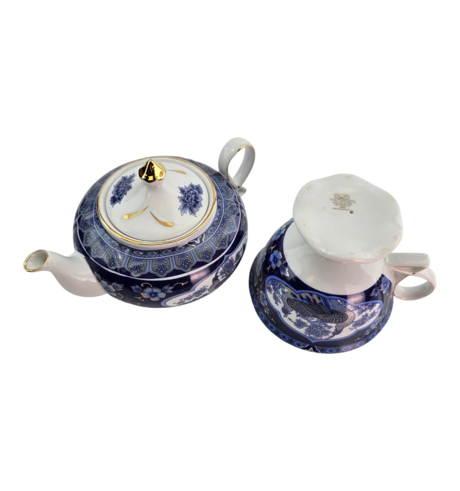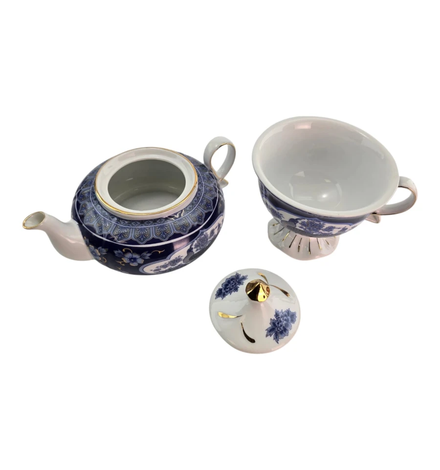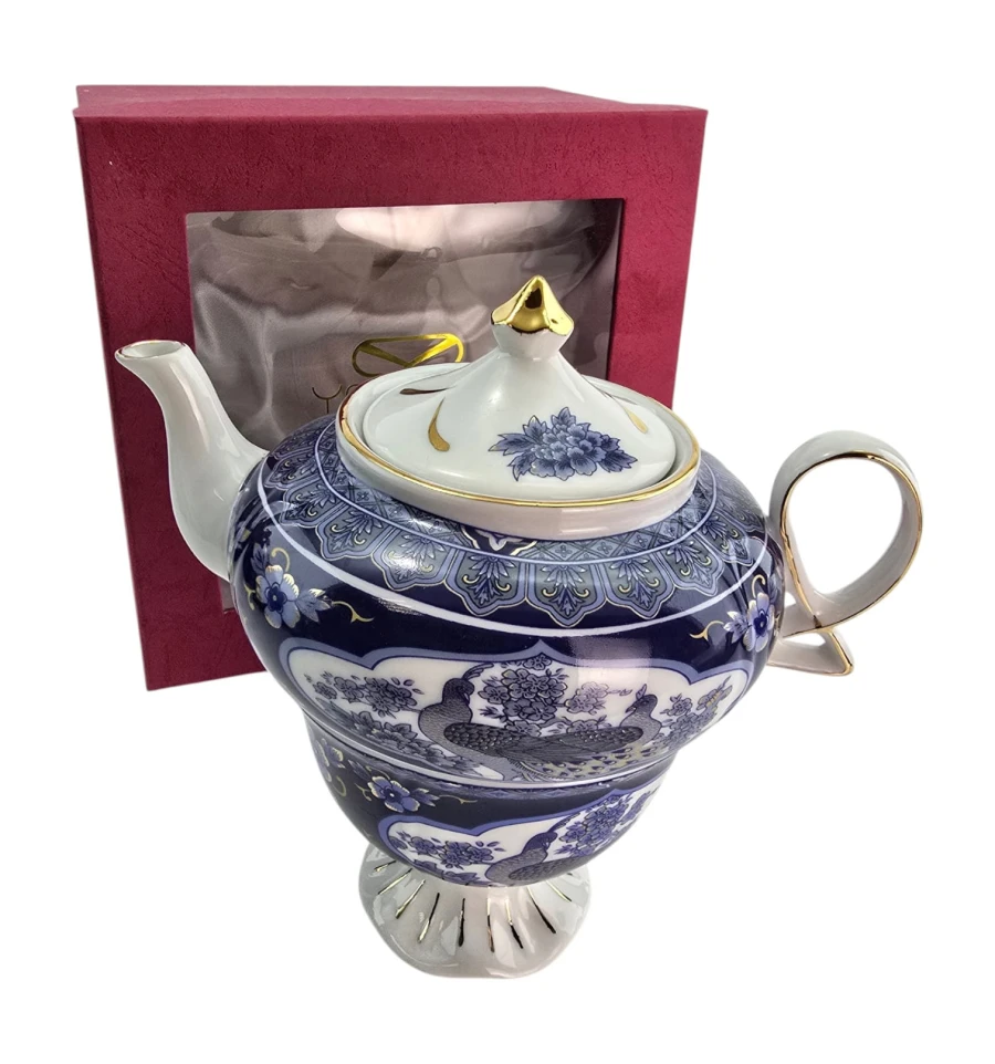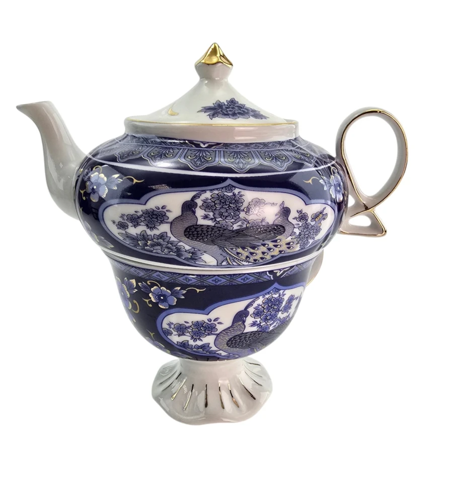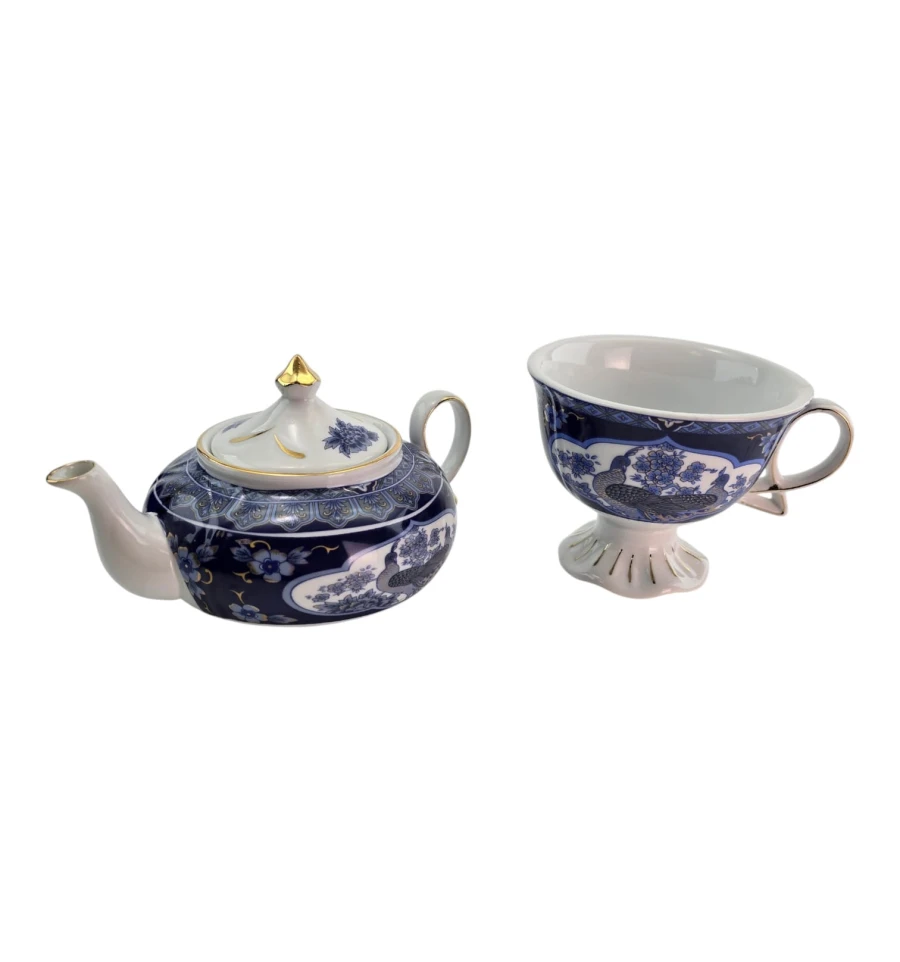 Чайник и чашка выполнены в глубоком тёмно-синем цвете с золотыми акцентами. Центральный декор — белые медальоны с изображением павлинов среди цветов. Дополнительные элементы: золотые орнаменты, цветочные узоры и тонкие золотые ободки. Чашка стоит на фигурной ножке с золотыми лучами. Чайник имеет удобную ручку, носик и крышку с золотой кнопкой.