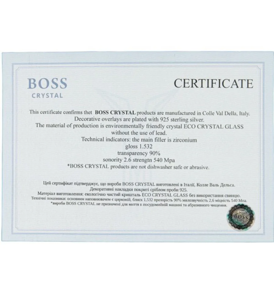 Этот сертификат подтверждает, что изделия Boss Crystal изготовлены в Италии, Колле Валь Дельса. Декоративные накладки покрыты серебром пробы 925.
