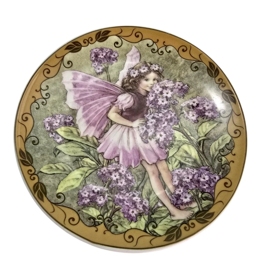 На тарелке изображена нежная фея с большими розово-фиолетовыми крыльями, которая держит большой букет сирени. Композицию обрамляет золотой бордюр с декоративными завитками и листочками. На обратной стороне тарелки есть специальное крепление (металлический треугольник) для подвешивания на стену.