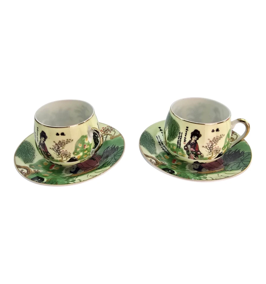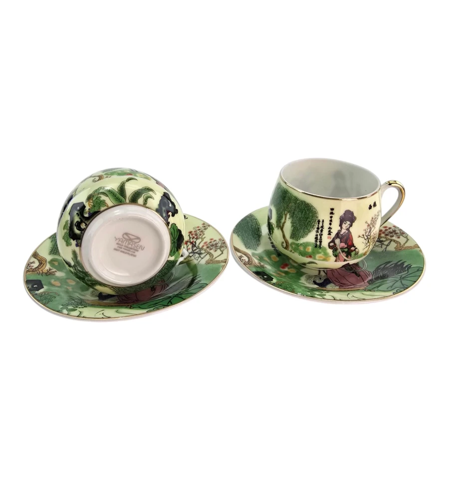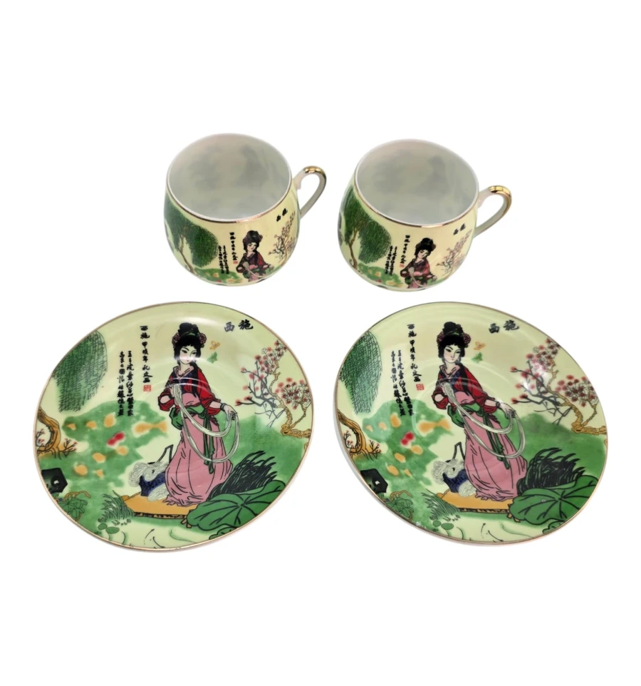 Каждая чашка и блюдце украшены традиционным японским декором на светло-зелёном фоне: грациозные девушки в кимоно среди сада с деревьями, цветами и листьями лотоса. По краю — тонкий золотой ободок. На изделиях присутствуют японские иероглифы.