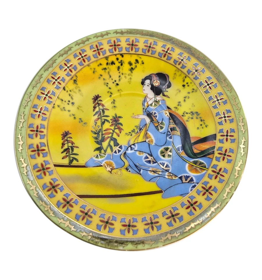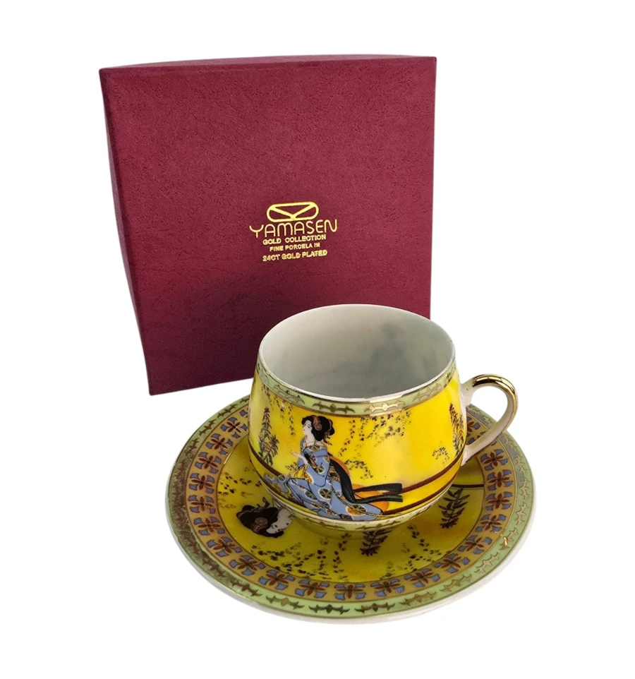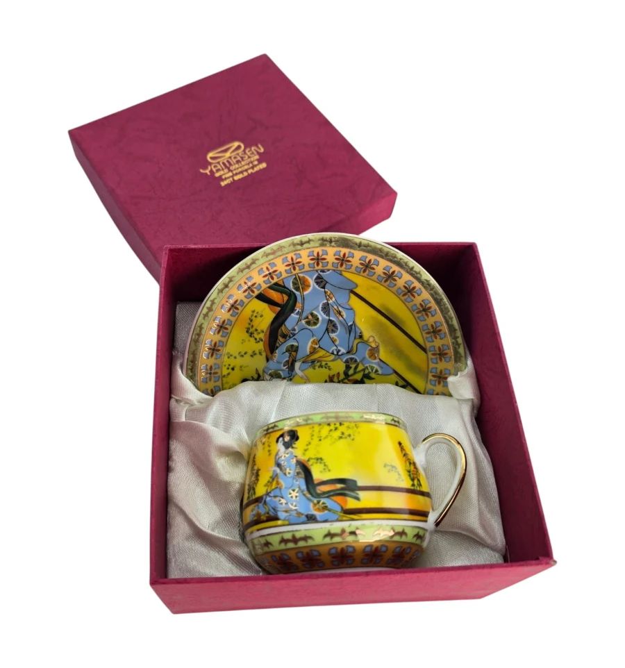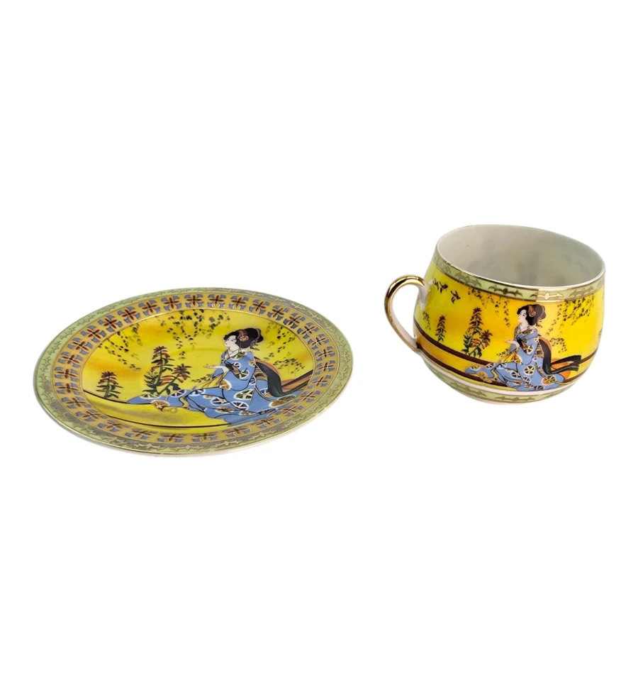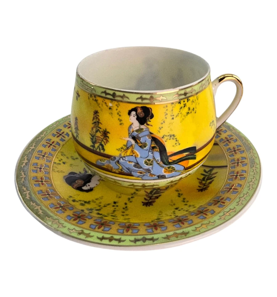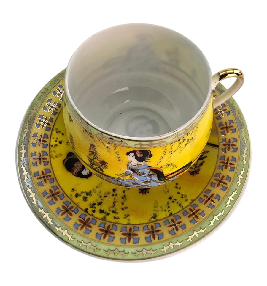 Яркий жёлтый фон, центральное изображение — традиционная японская гейша в синем кимоно на фоне природы. По краю чашки и блюдца — зелёный бордюр с цветочным орнаментом и золотым декором. Ручка чашки также украшена золотом.