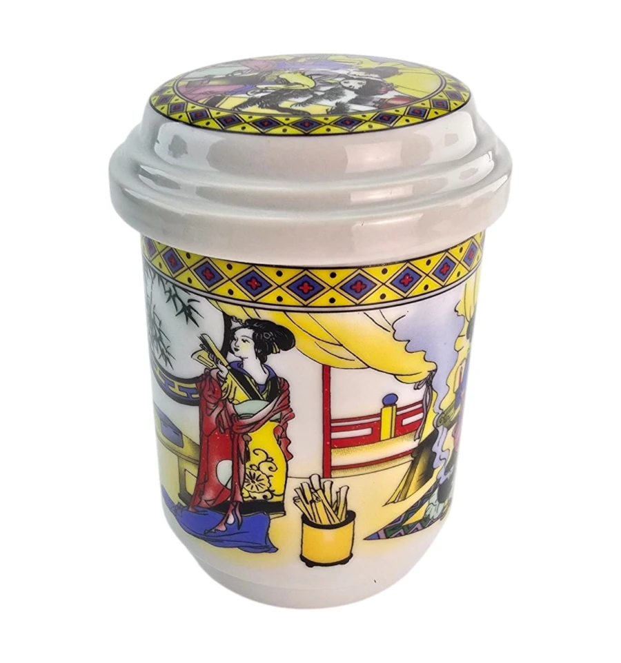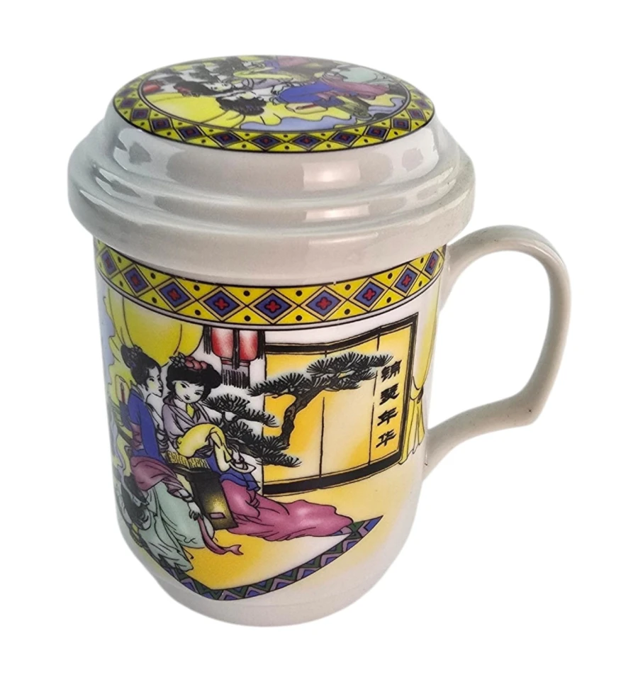 Яркий дизайн в традиционном японском стиле: две девушки в цветных кимоно на фоне архитектуры и природы. В комплекте съёмное ситечко с отверстиями для заваривания чая, трав или кофе.